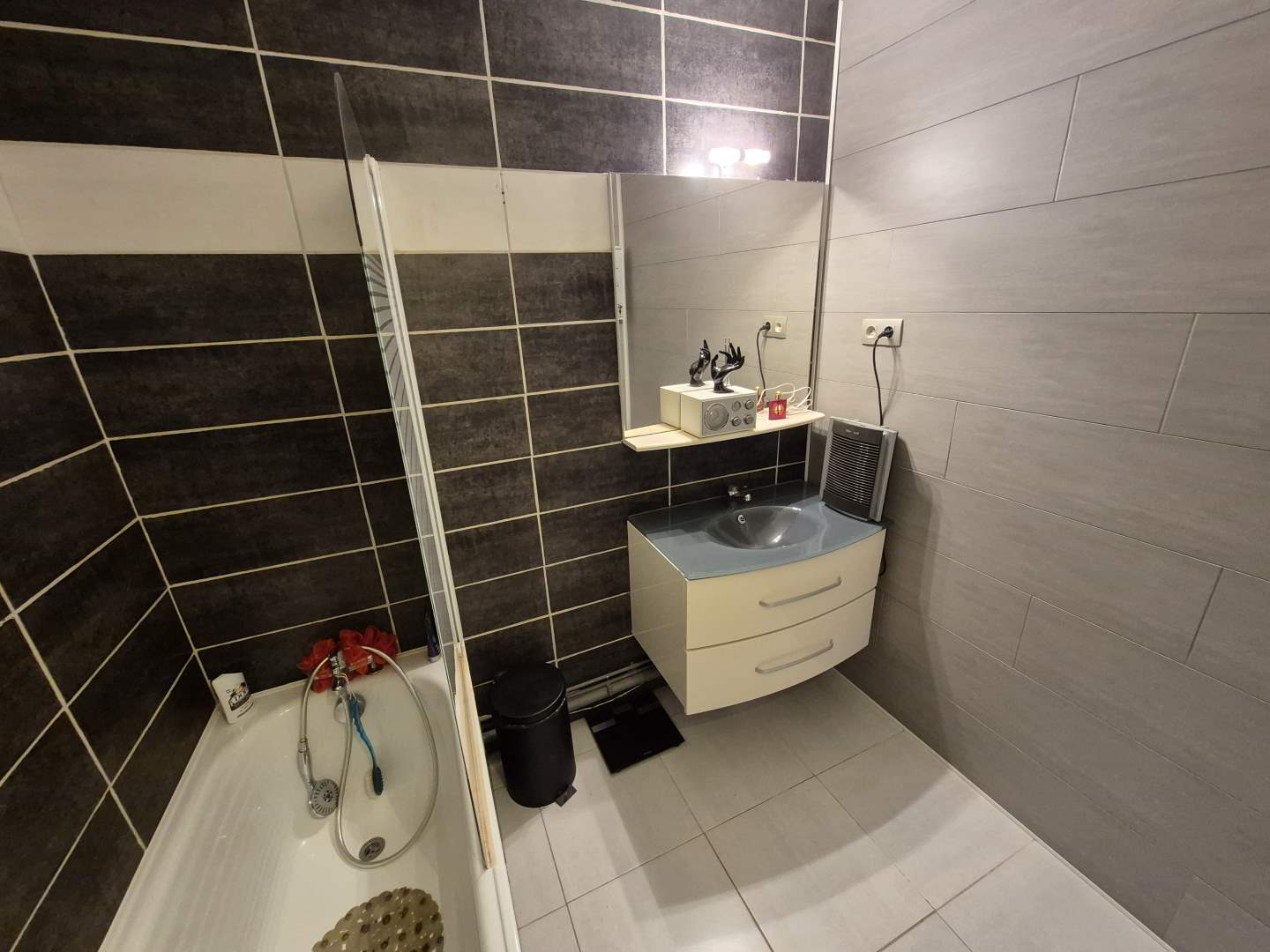 entrée, cuisine aménagée et équipée ouverte (13.58m²) avec séjour - salon de 30m² donnant sur balcon, couloir, WC, débarras, deux chambres (11,17m² et 9.32m²), salle de bains (vasque, baignoire).