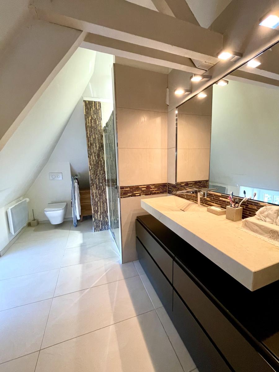 - à l'étage : chambre, bureau ou petite chambre d'enfant, salle d'eau à l'italienne récente avec wc.