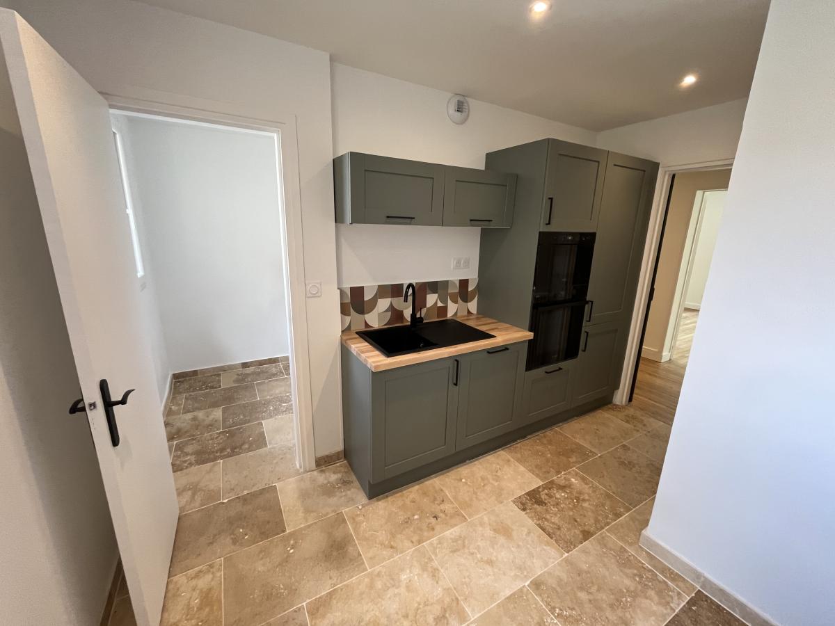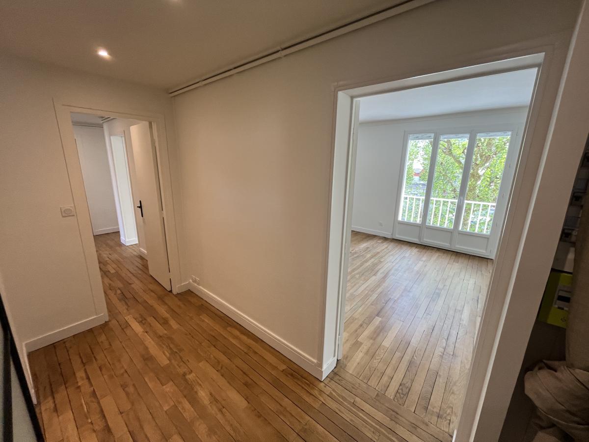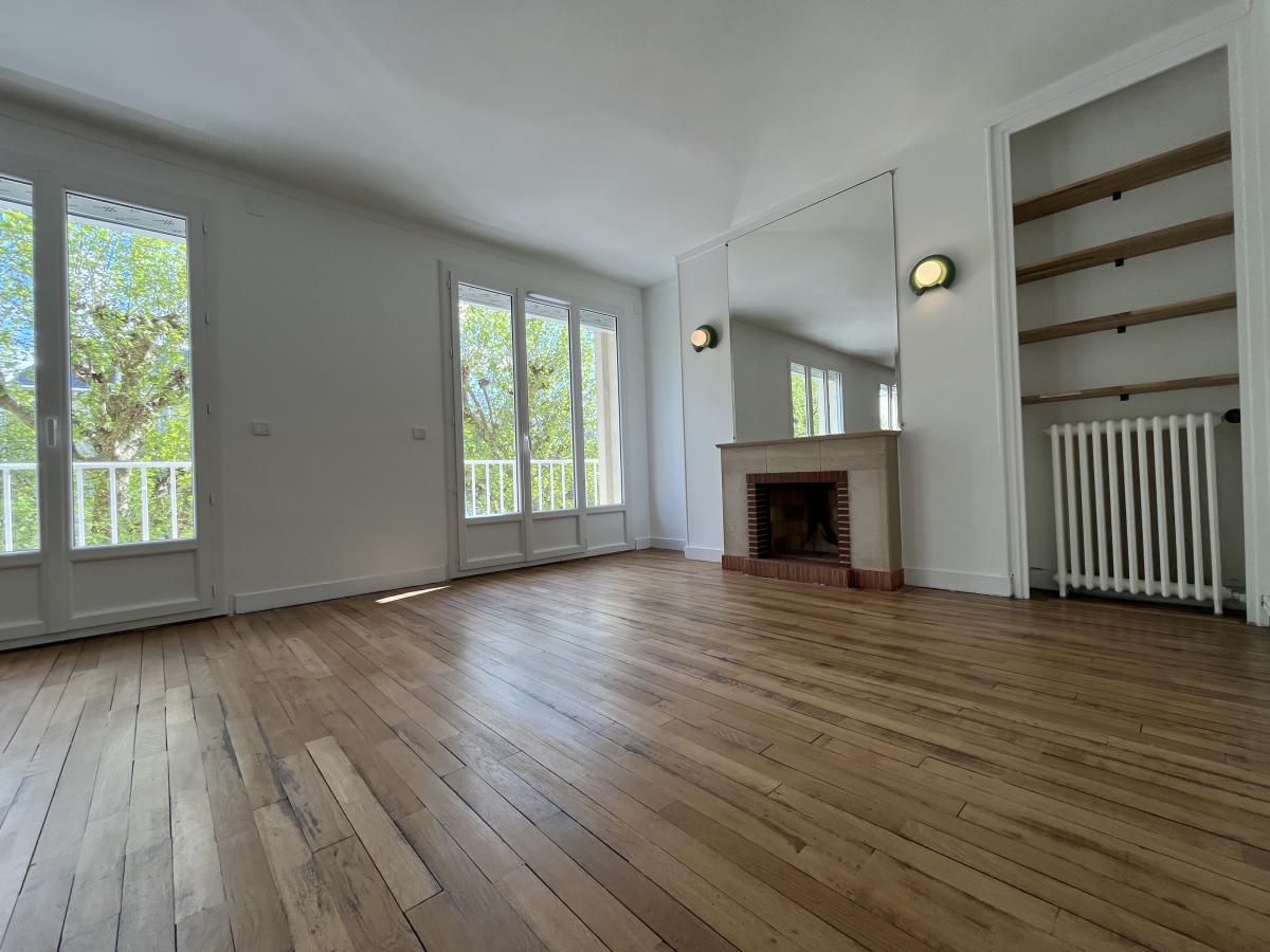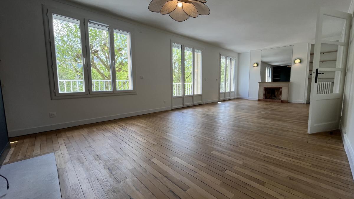 Un appartement de 5 pièces composé de : Entrée, Cuisine indépendante avec loggia, Dégagement, Double séjour lumineux avec cheminée, Trois chambres, Salle d'eau, WC séparés