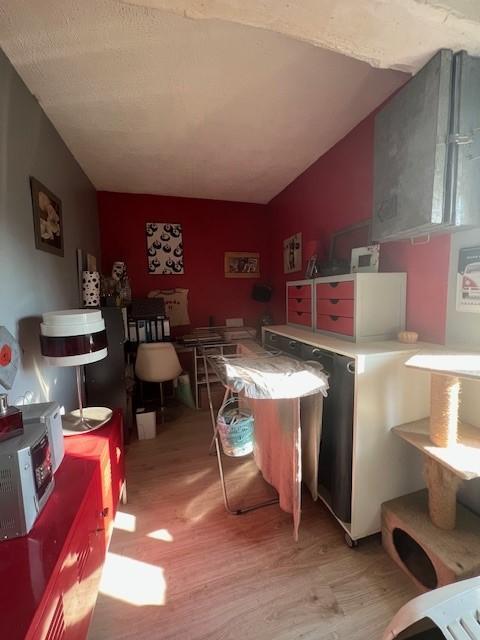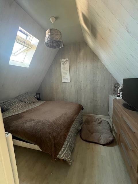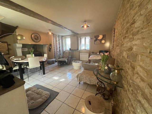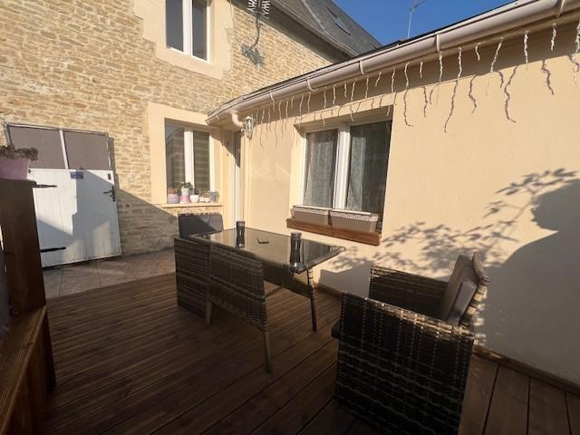 MEZIDON CANON, maison de ville construite en pierre mitoyenne d'un coté comprenant au RDC : cuisine, séjour-salon avec poêle à bois, salle d'eau et wc. Au 1er étage : bureau, une chambre. Au 2ème étage : petite chambre, salle de bains. Garage au fond du jardin. Jardin agréable de 502 m².