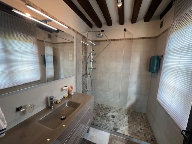- Au rez-de-chaussée : Entrée, salon, salle d'eau, wc, vestiaire, cuisien aménagée et équipée avec coin repas, salle-salon avec cheminée pierre.