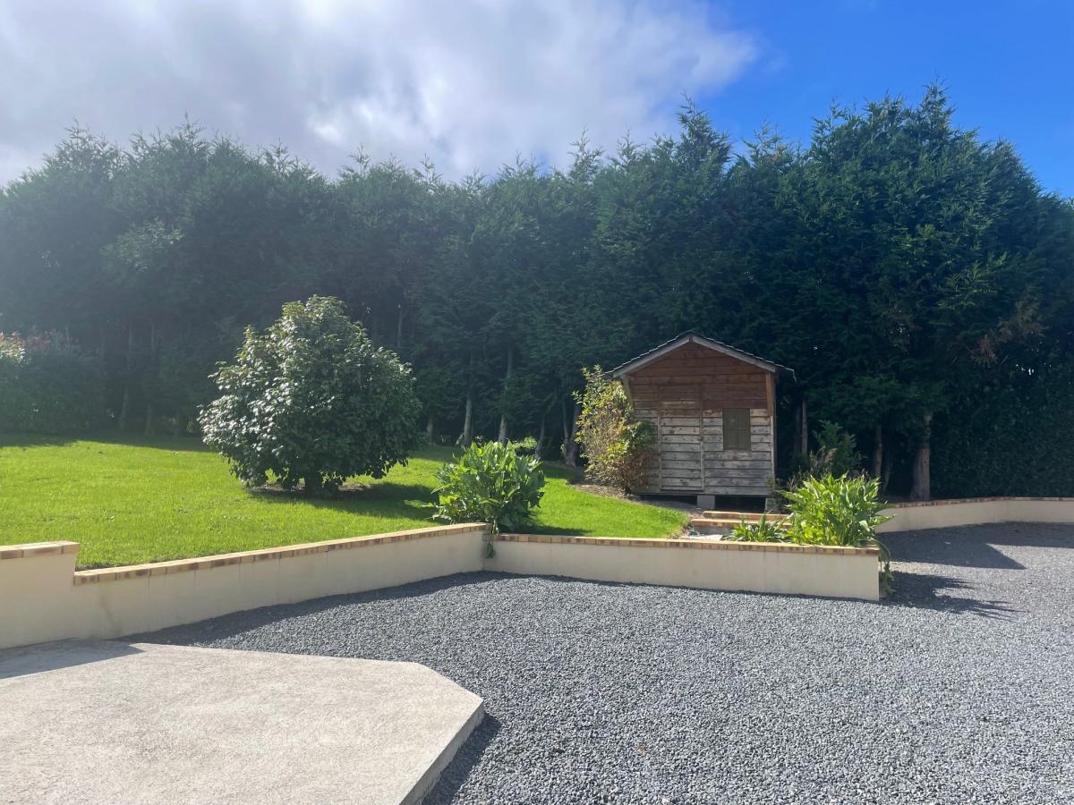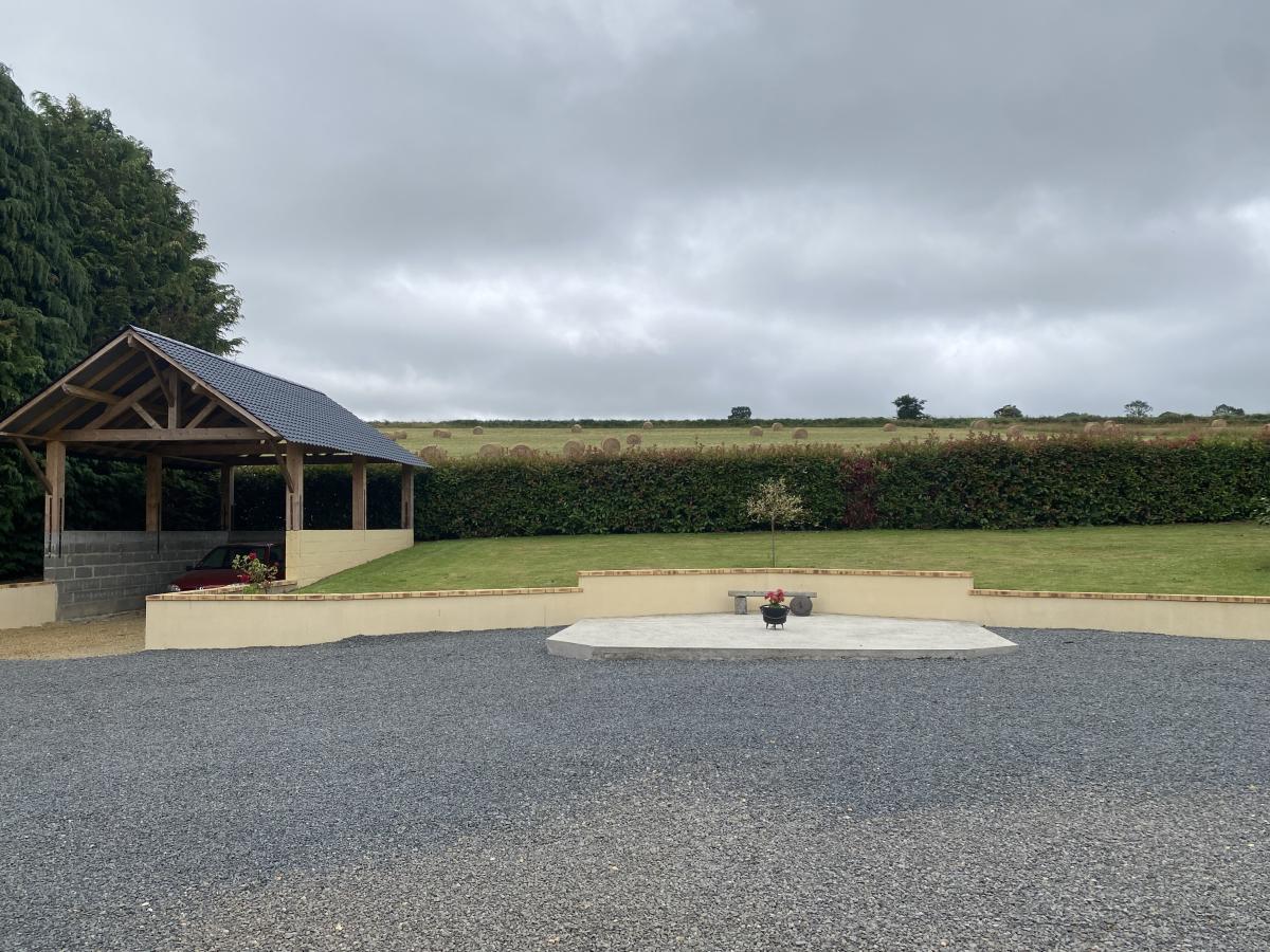 - au rez-de-chaussée : un salon avec poêle à bois donnant sur une cuisine aménagée avec coin-repas, une chambre, une salle d'eau, W.C.,