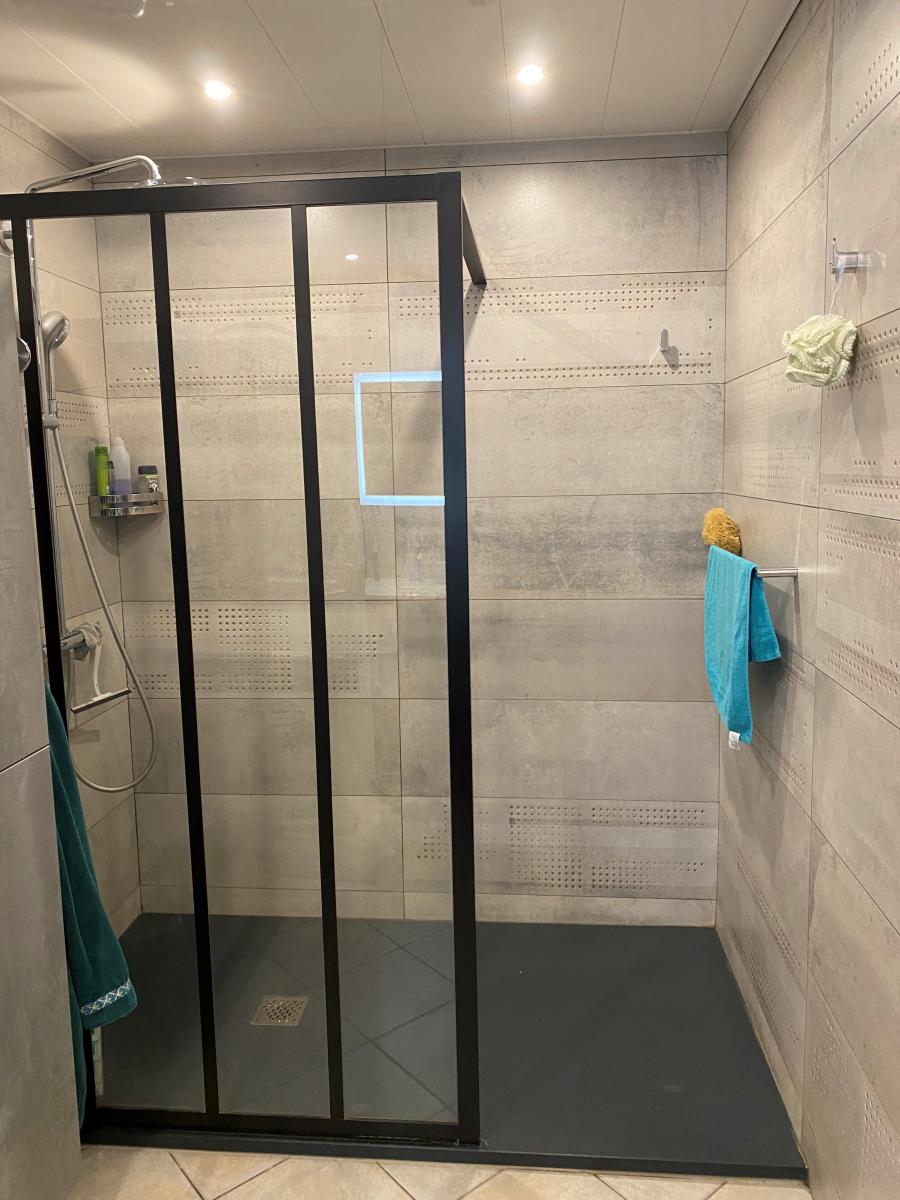 - au rez-de-chaussée : une entrée, une grande salle à manger -salon avec poêle à bois, une cuisine aménagée, un dégagement, une chambre, une salle d'eau récente, W.C. avec lave-mains, un vestiaire, une lingerie,