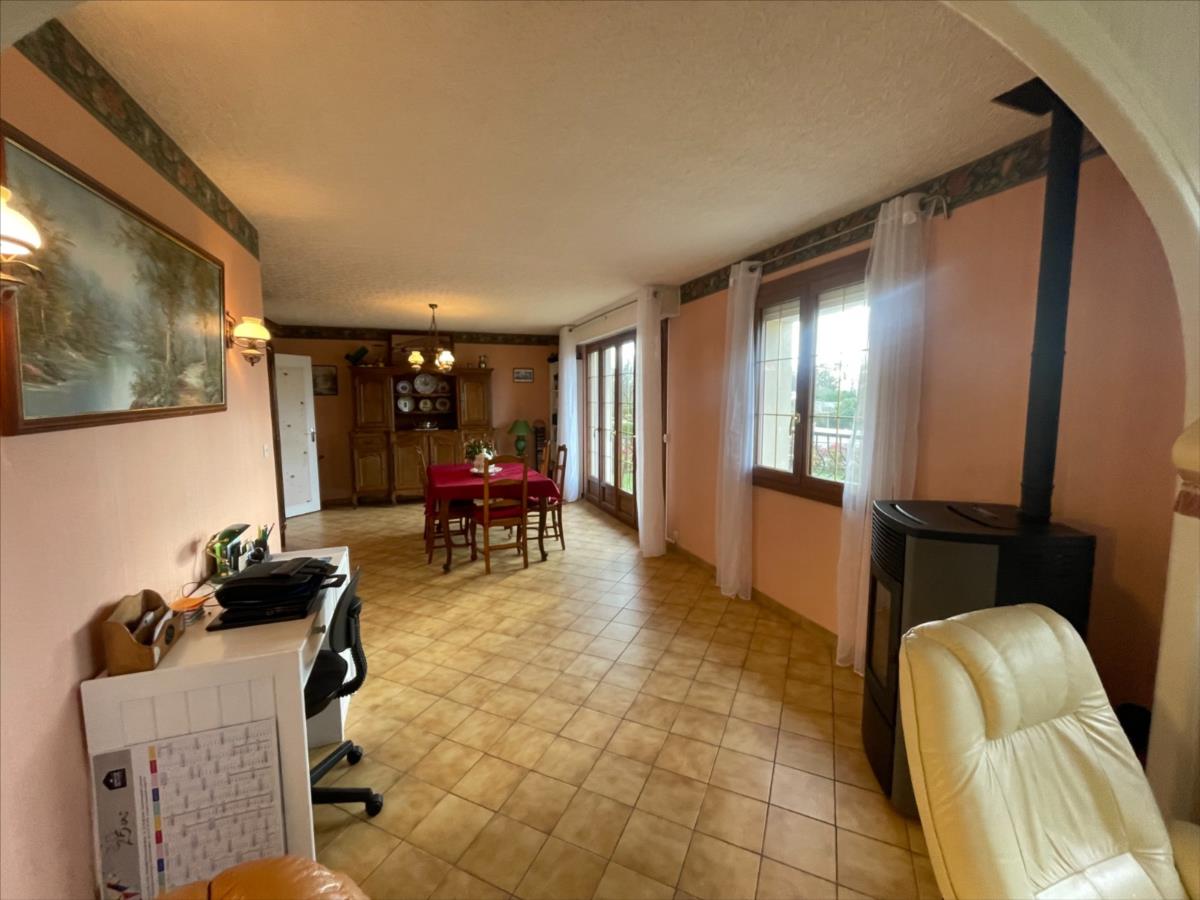 à manger et séjour avec poêle, salon ou chambre 3. Sous-sol complet. Jardin agréable