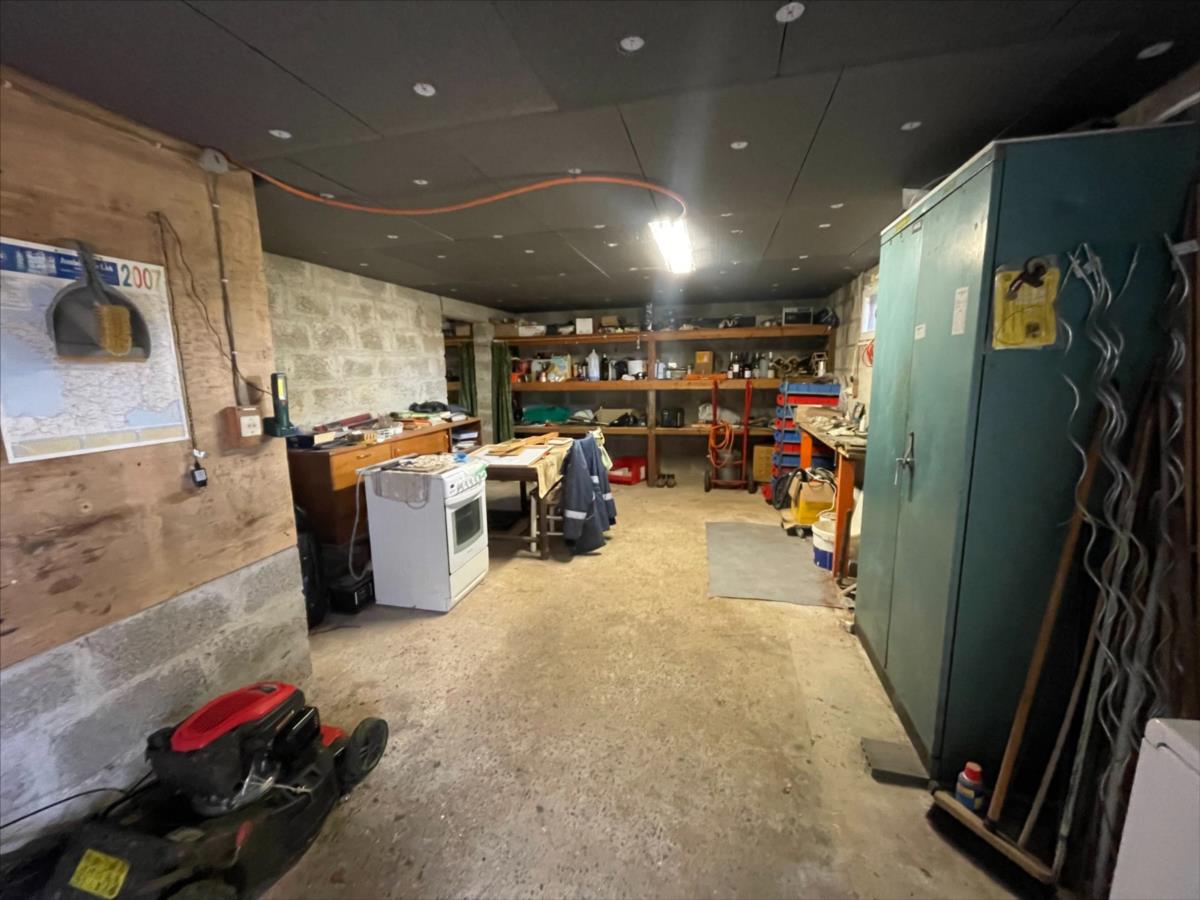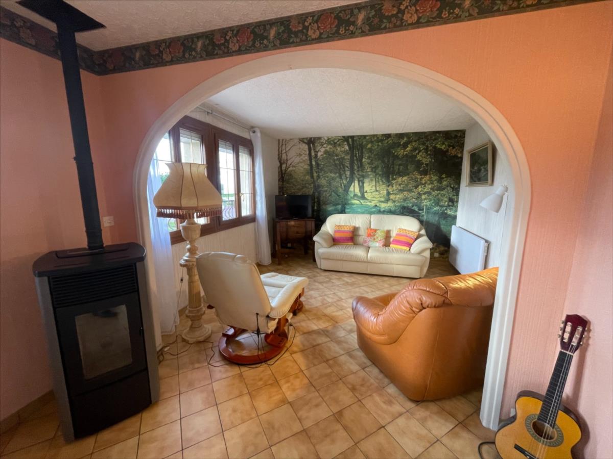 à manger et séjour avec poêle, salon ou chambre 3. Sous-sol complet. Jardin agréable