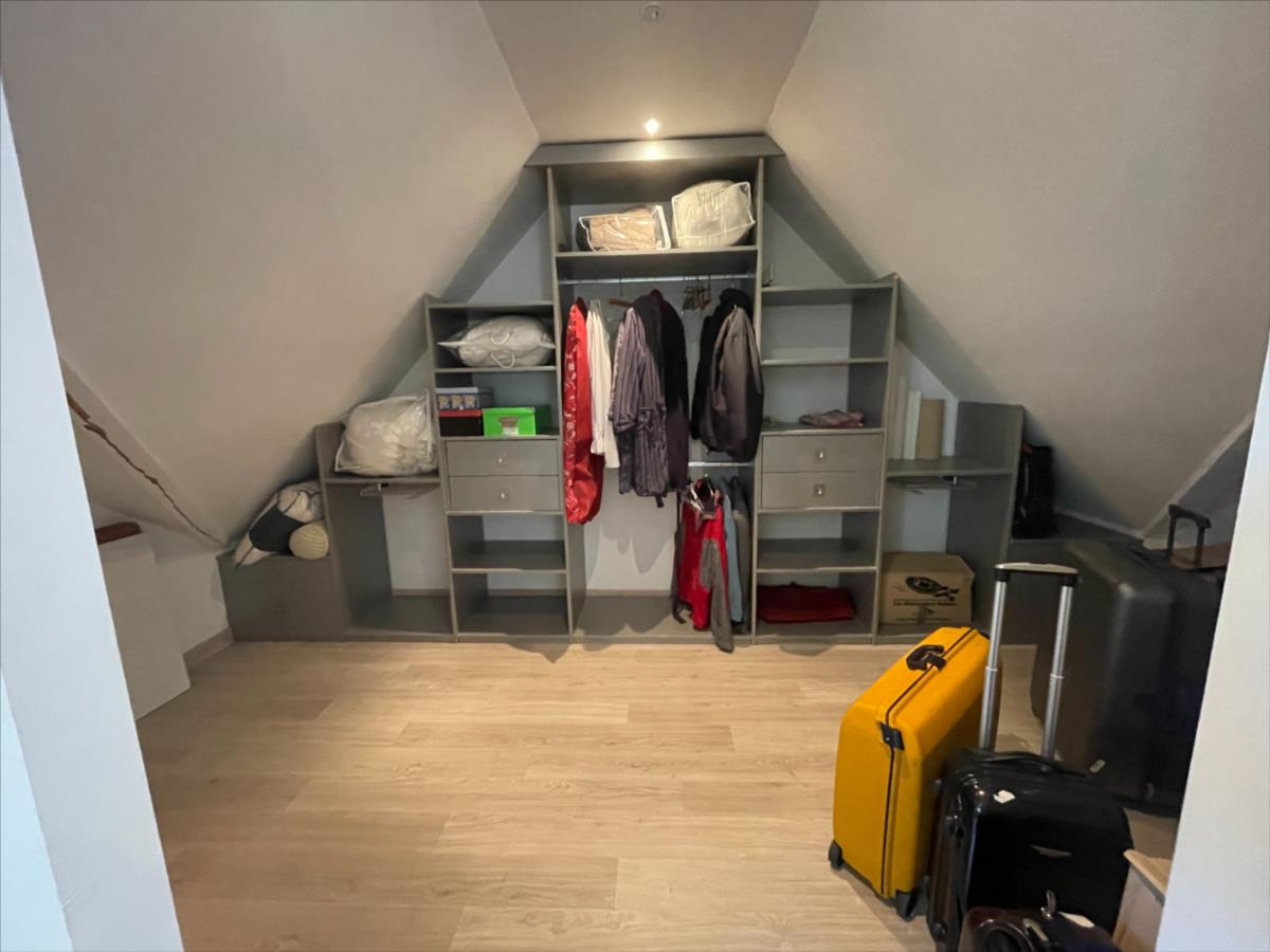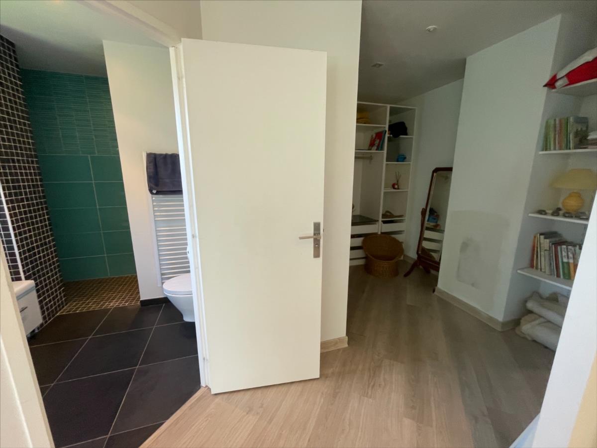 WC, placard, vaste séjour- salon 100m² avec cheminée et terrasse avec partie abritée,