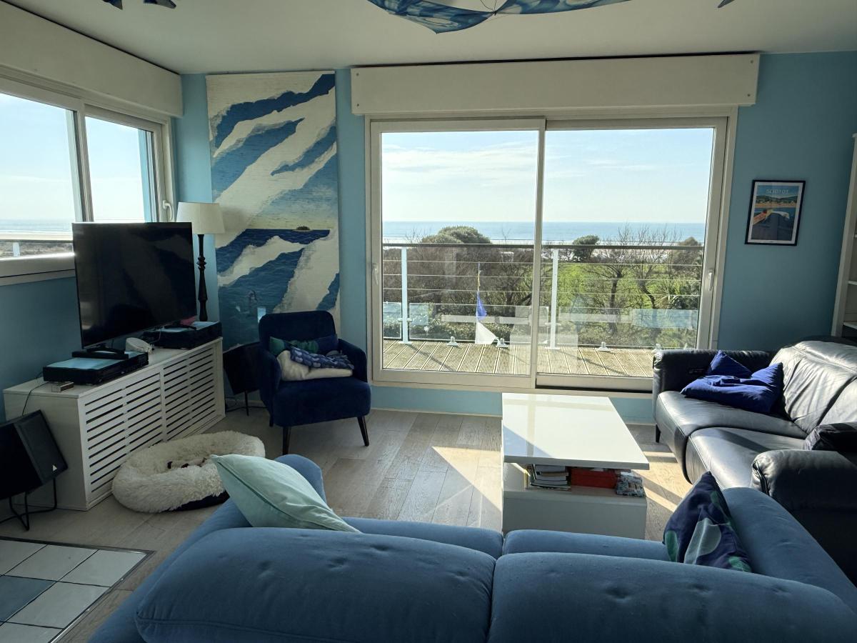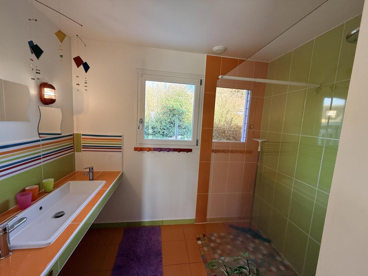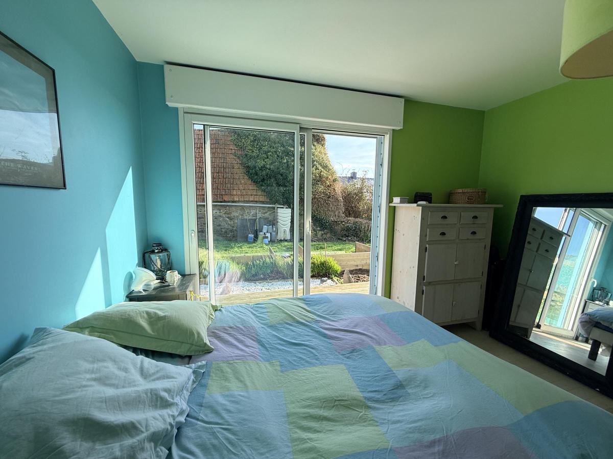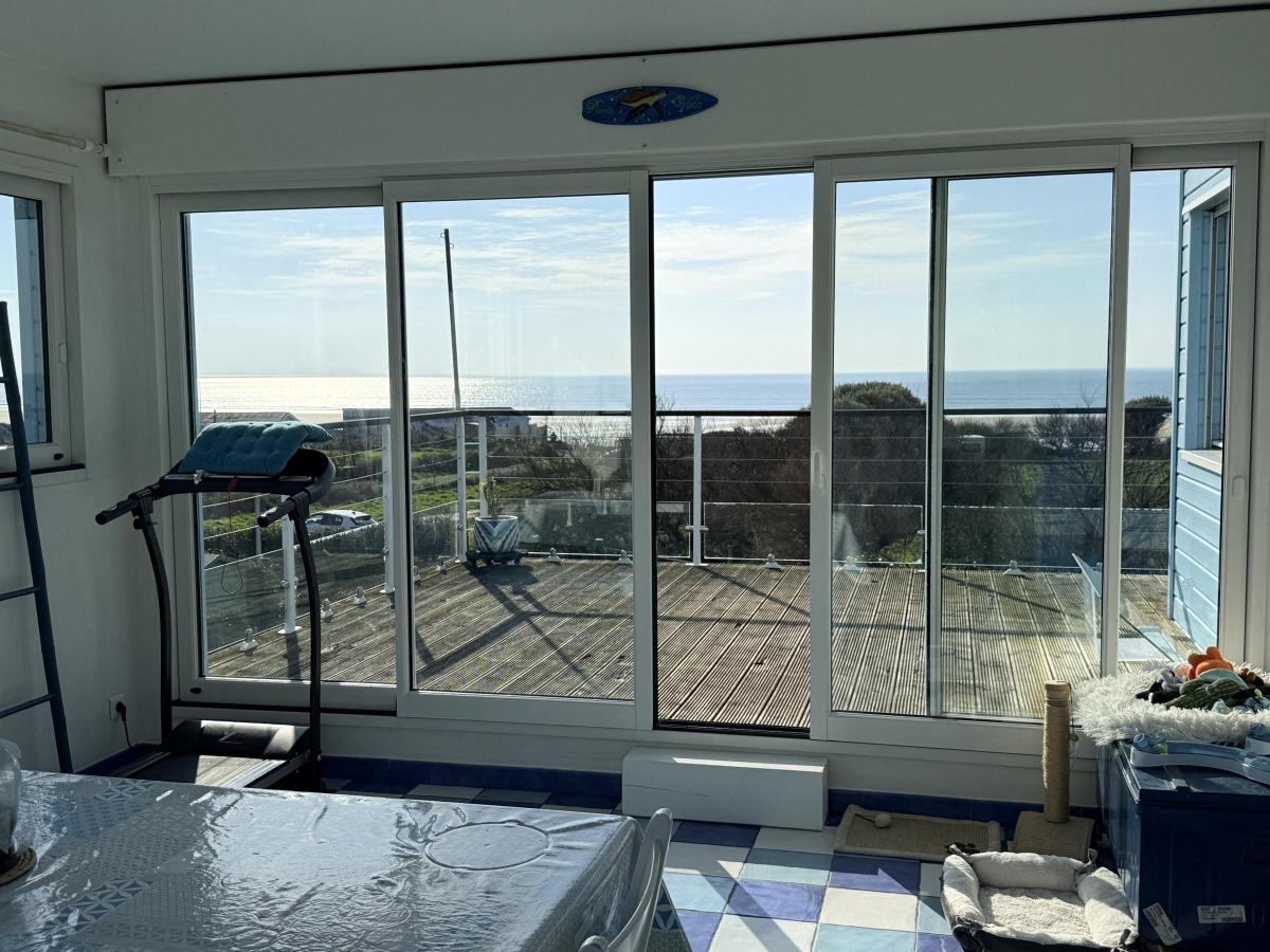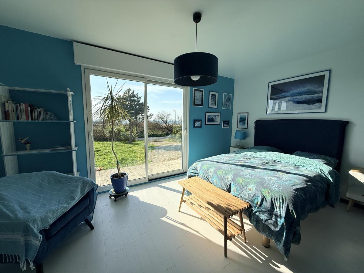- à l'étage, offrant une vue imprenable sur la mer: le séjour-salon avec poêle à bois baigné de lumière grâce aux grandes baies inondant cet espace familial ouvert sur la cuisine et la salle à manger. Une cinquième chambre et une terrasse sur pilotis de laquelle la vue est à couper le souffle complètent ce niveau ! Autre WC à cet étage.