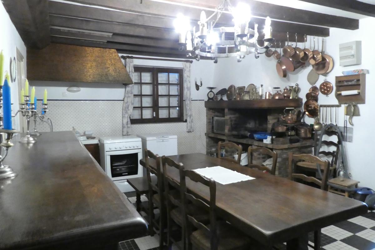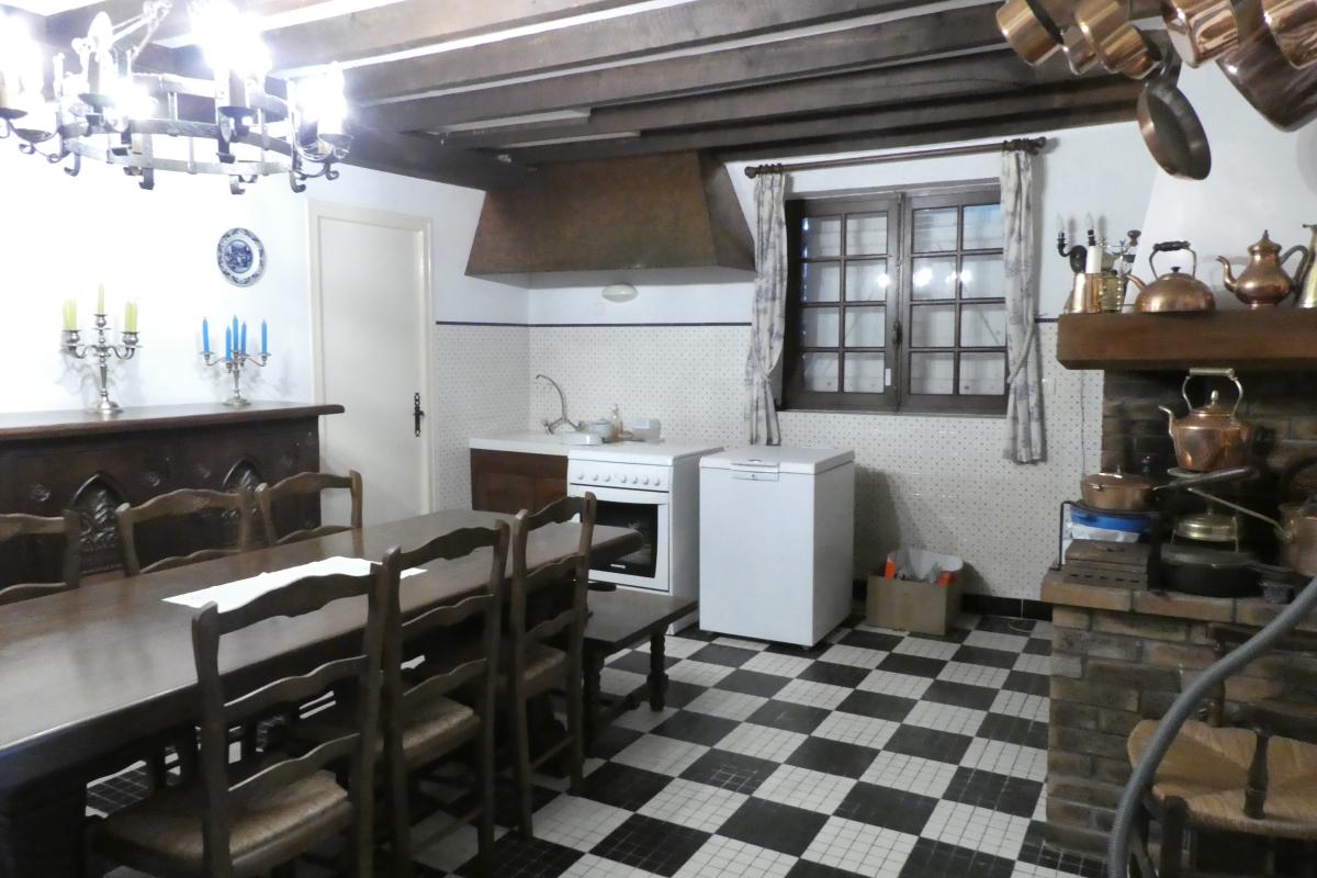 Au rez-de-chaussée : arrière-cuisine, salle de douche, grande cuisine avec cheminée, salle à manger avec cheminée, petit séjour, grand salon vitré, wc