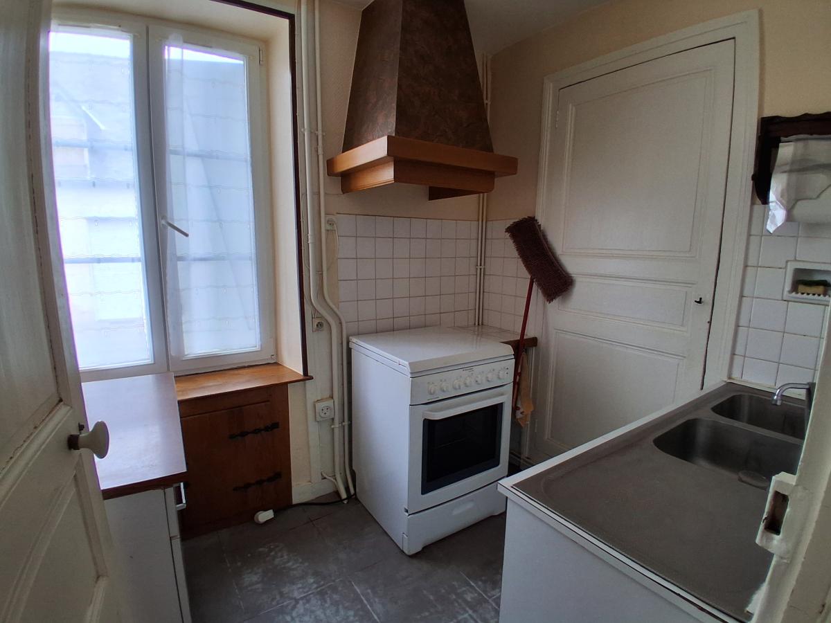 Maison située dans bourg avec commerces et écoles, comprenant : RDC : entrée - cuisine - arrière cuisine - séjour ; Etage : palier - deux chambres dont une avec salle d'eau - Cabinet de toilette avec WC - Grenier au dessus pouvant être aménagé. Cave en sous-sol. Chaufferie en appentis. Garage. Cour et jardin d'agrément. L'ensemble pour 2335 m². Tout à l'égout. Menuiseries PVC.