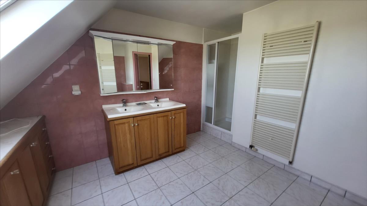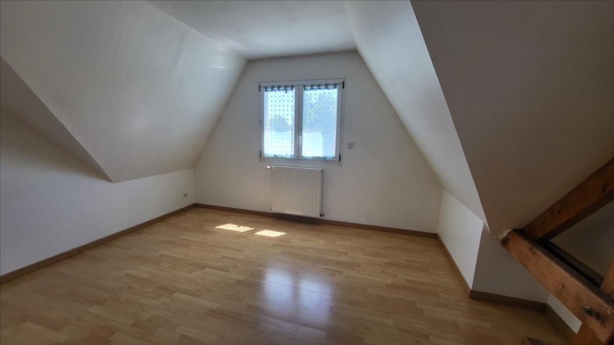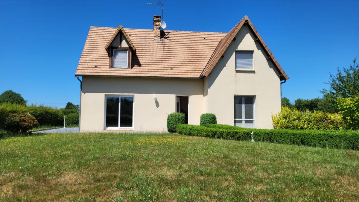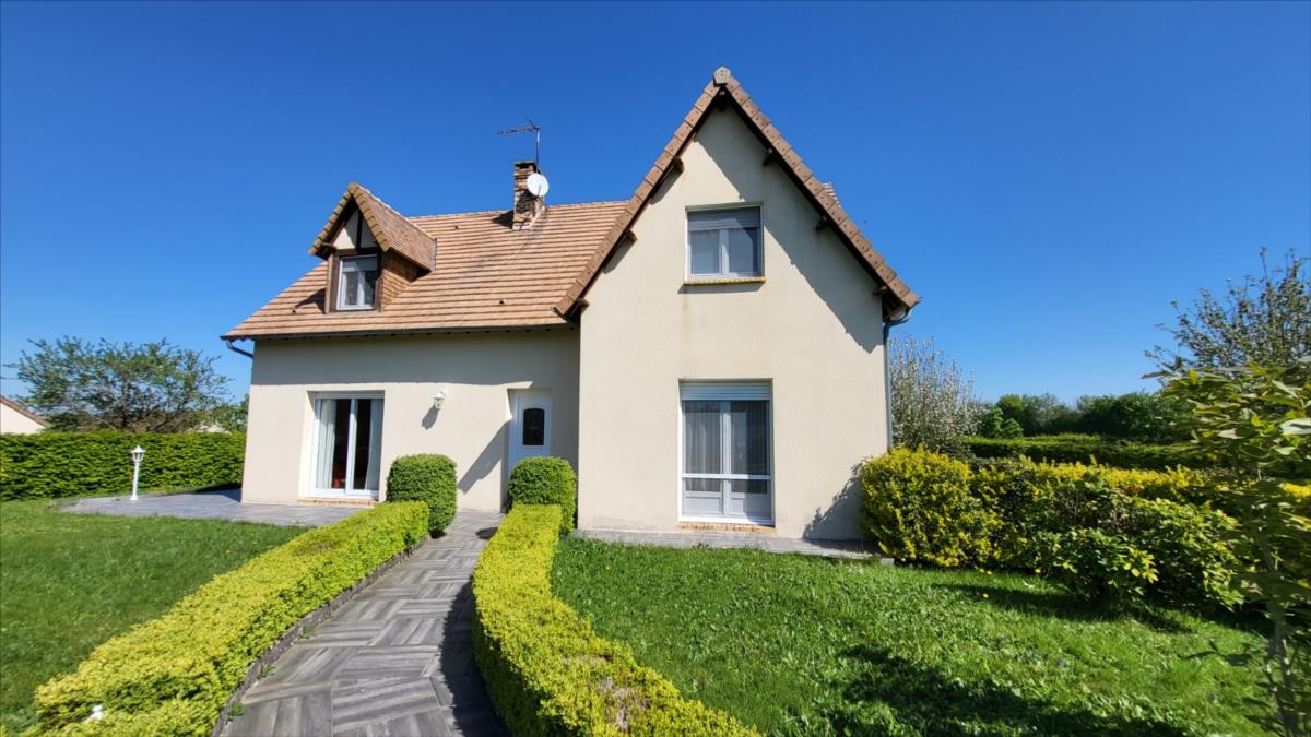 Dans un quartier au calme, et proche de quelques commerces, belle maison d'environ 135 m² bien entretenue comprenant : belle entrée avec escalier, séjour avec cheminée équipée d'un insert ouvert sur cuisine aménagée et équipée (réfrigérateur, hotte aspirante, plaque de cuisson), une chambre avec salle de douche à l'italienne, wc séparés, bureau ou chambre avec placards ; à l'étage : pièce-mezzanine surplombant l'entrée, trois chambres, wc séparés, grande salle de bains avec baignoire et douche), placards et radiateurs sèche serviettes ; chauffage au fioul + cheminée ; Volets roulants;  sous-sol complet avec adoucisseur d'eau comprenant buanderie avec point d'eau, garage, cave à vin l'ensemble sur 1030 m² de jardin avec terrasse.