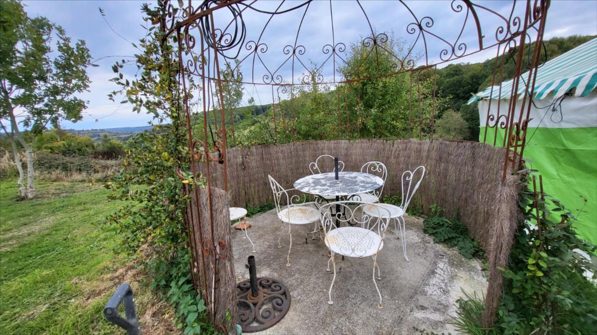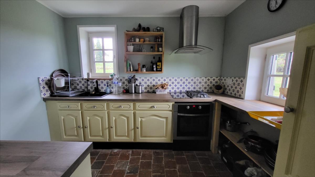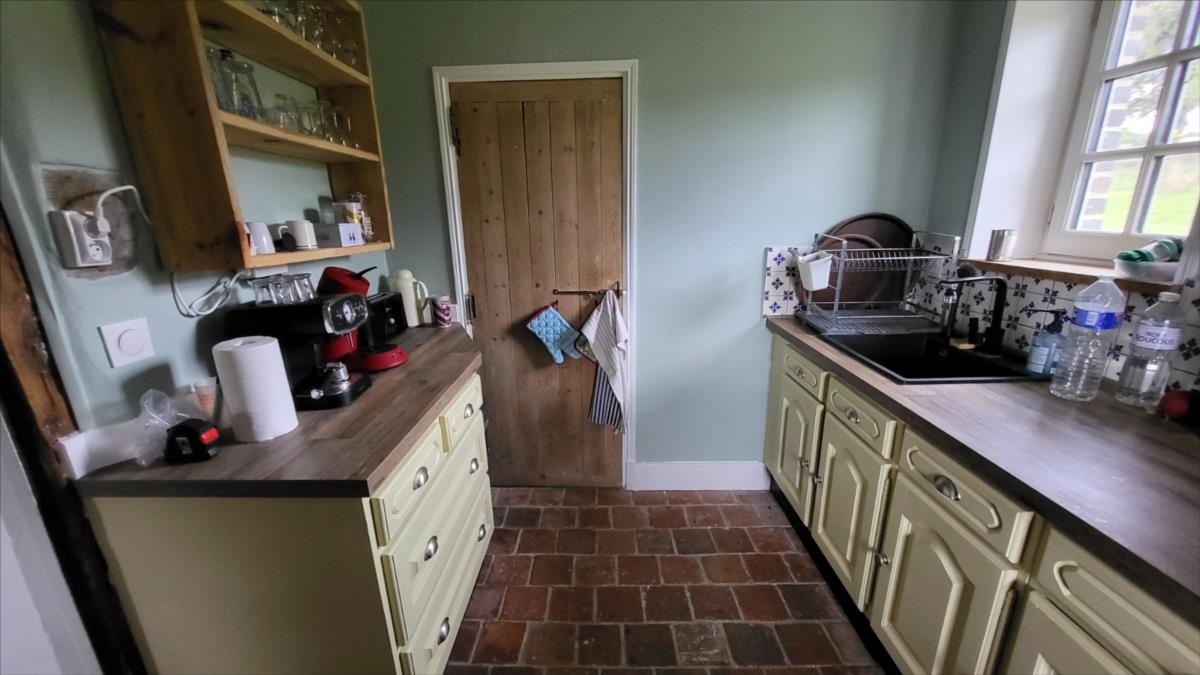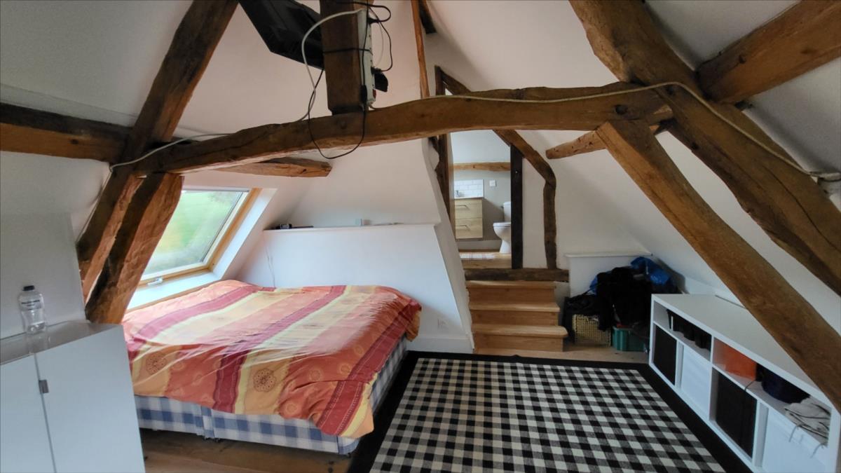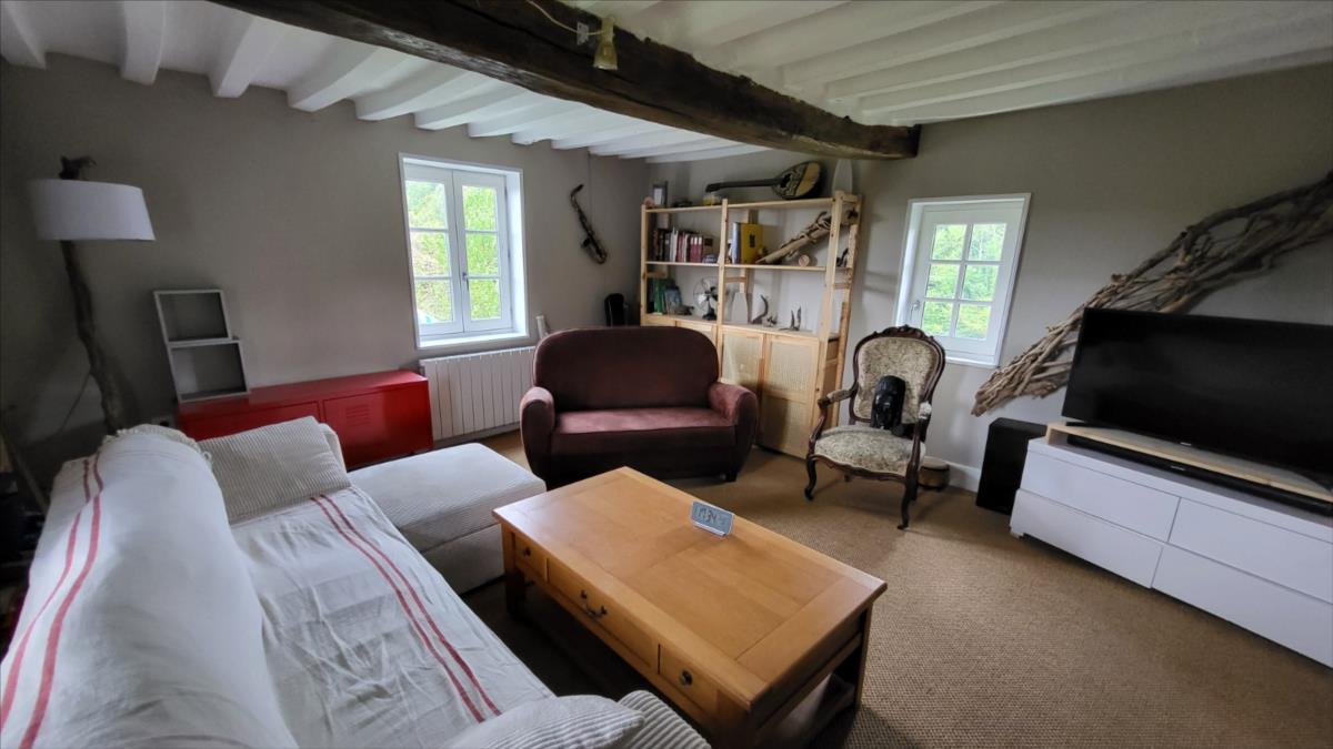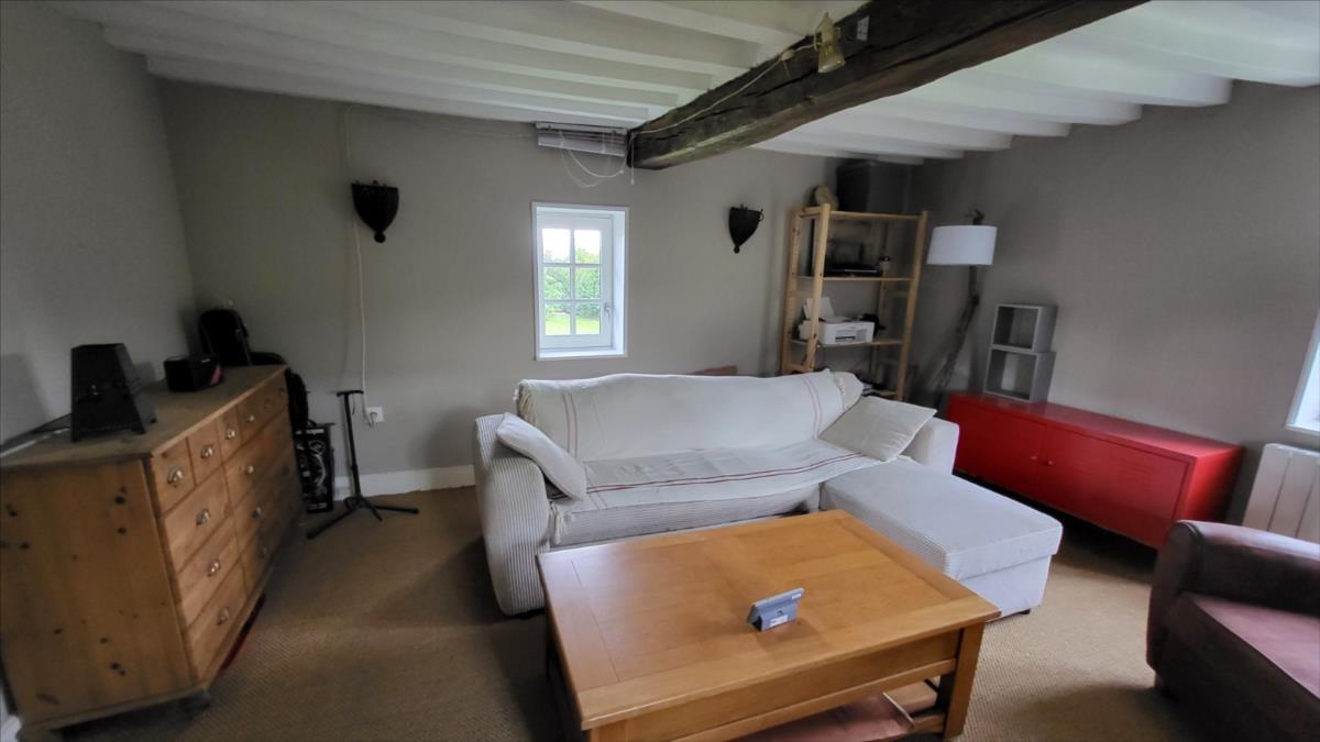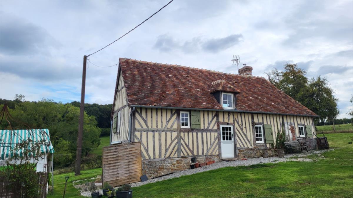 Surplombant les collines du Pays d'Auge, avec une vue magnifique, fermette en colombage rénovée avec goût  sur 1706 m² comprenant : salle à manger avec cheminée équipée d'un poêle et tomettes au sol, cuisine aménagée et équipée avec tomettes au sol, wc avec lave-mains avec tomettes au sol, salon ; au 1er étage :une chambre avec charpente apparente et salle de bains privative avec wc et radiateur sèche-serviettes; petit grenier. cave à usage de cuisine d'été; Fenêtres en chêne double vitrage. Isolation des murs et cave. Chauffage par poêle à bois + radiateurs électriques récents.Dépendance à usage de garage-atelier.  Terrain avec gloriette en fer forgé avec électricité.  Les informations sur les risques auxquels ce bien est exposé sont disponibles sur le site Géorisques : www. georisques. gouv. fr