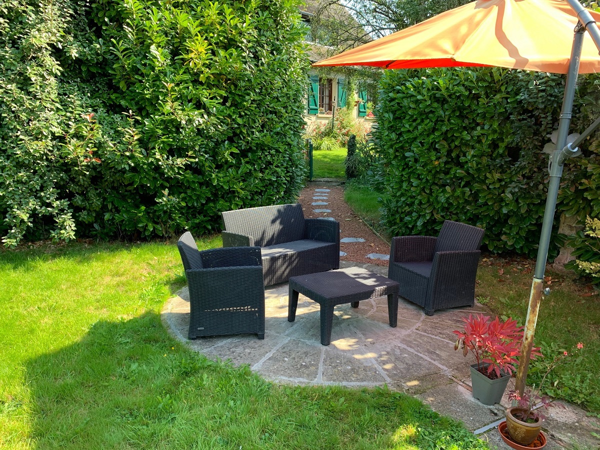 - Deuxième chambre à coucher (3,13 m x 3,8 m), radiateur, parquet au sol et deux fenêtres en bois donnant sur le jardin,