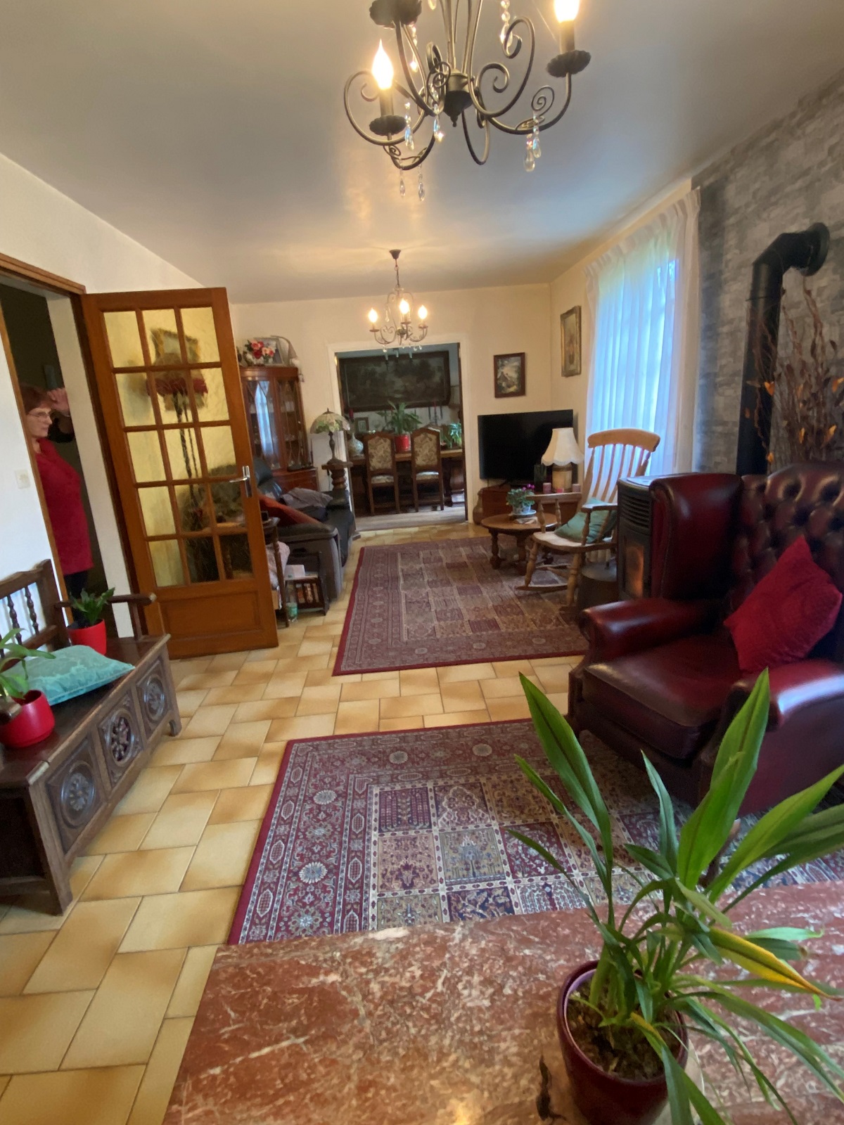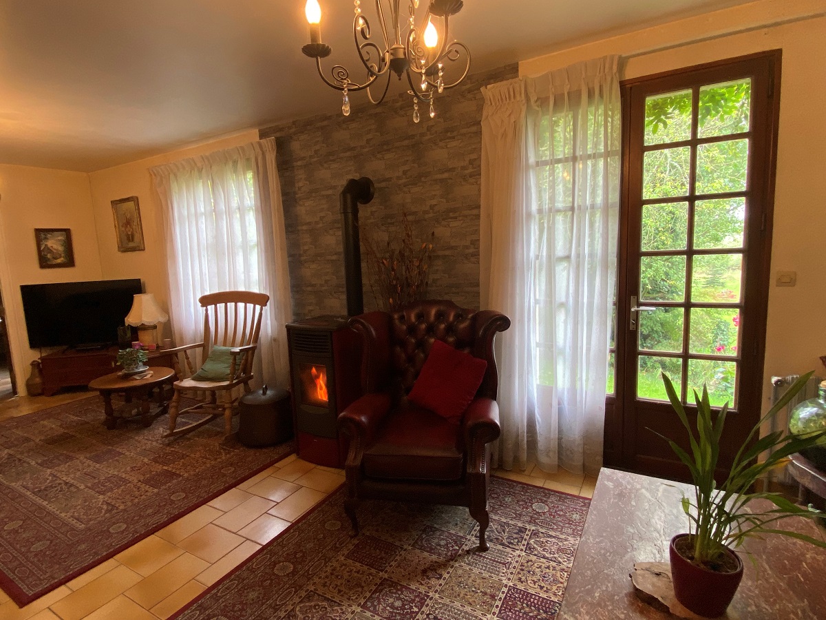 - Salon (8 m x 3,4 m) avec une fenêtre et une porte fenêtre en bois donnant sur le jardin à l’arrière de la maison. Le salon comporte un poêle à granulés installé il y a quatre ans environ. Carrelage au sol.