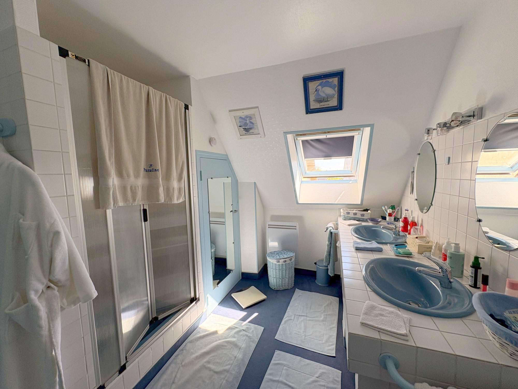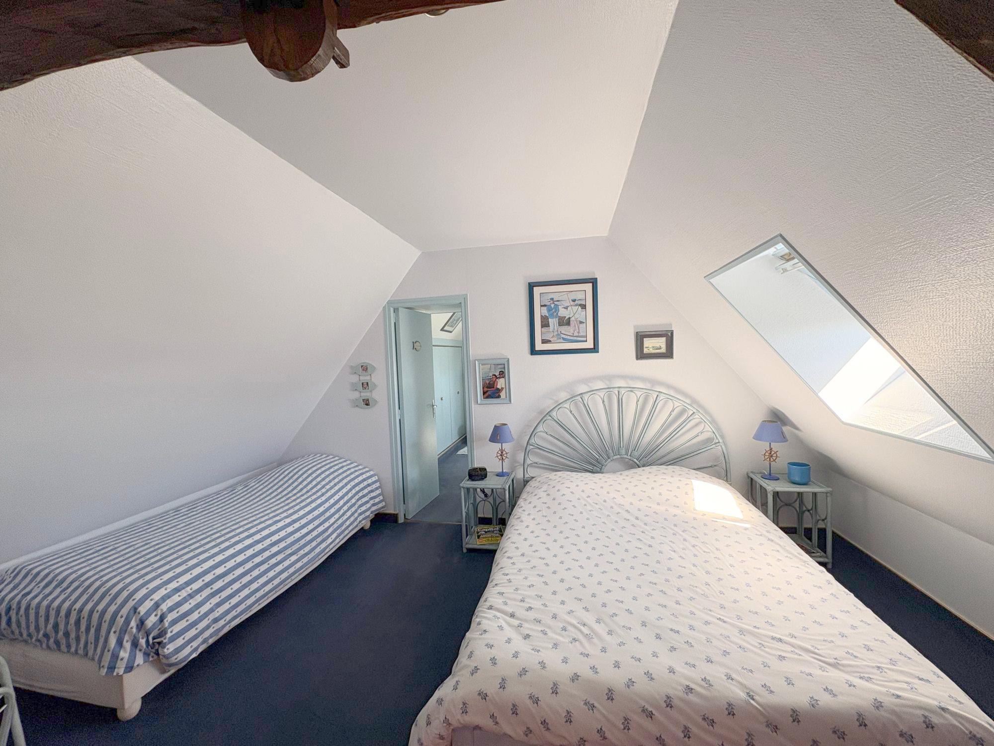 Au 1er étage : un palier desservant deux chambres ainsi qu'une salle de bain avec douche et toilettes.