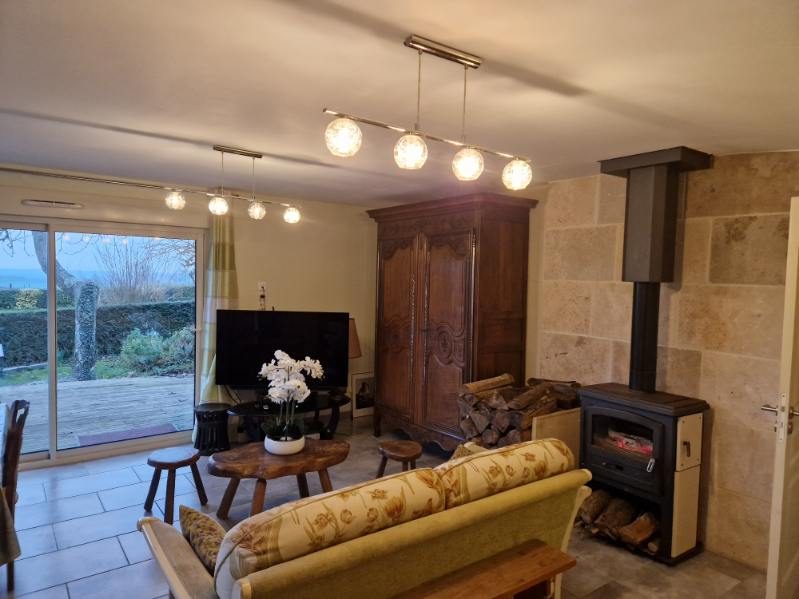 Maison de 115m²: séjour-salon, cuisine dînatoire, chambre, salle de bains et wc.
