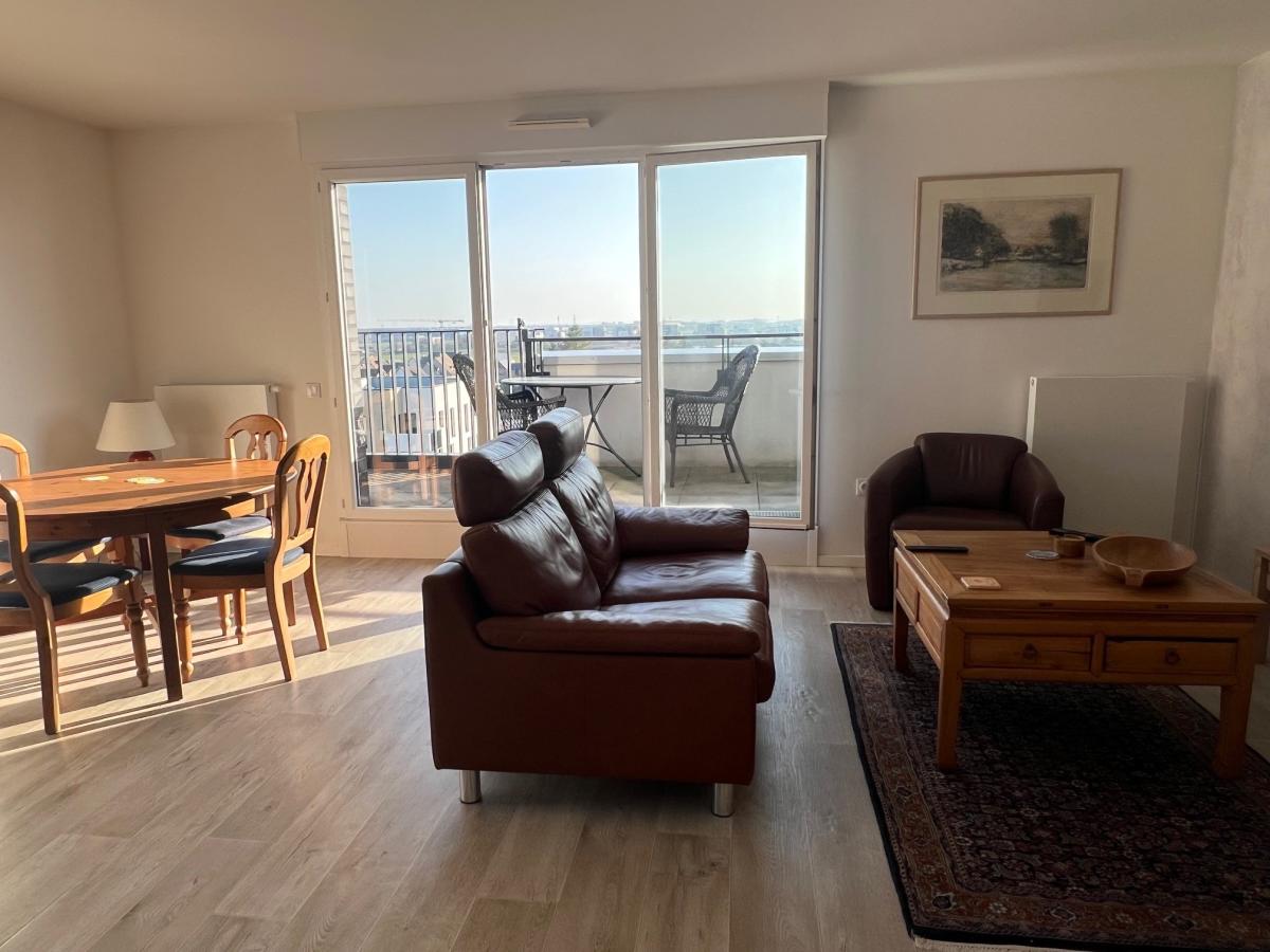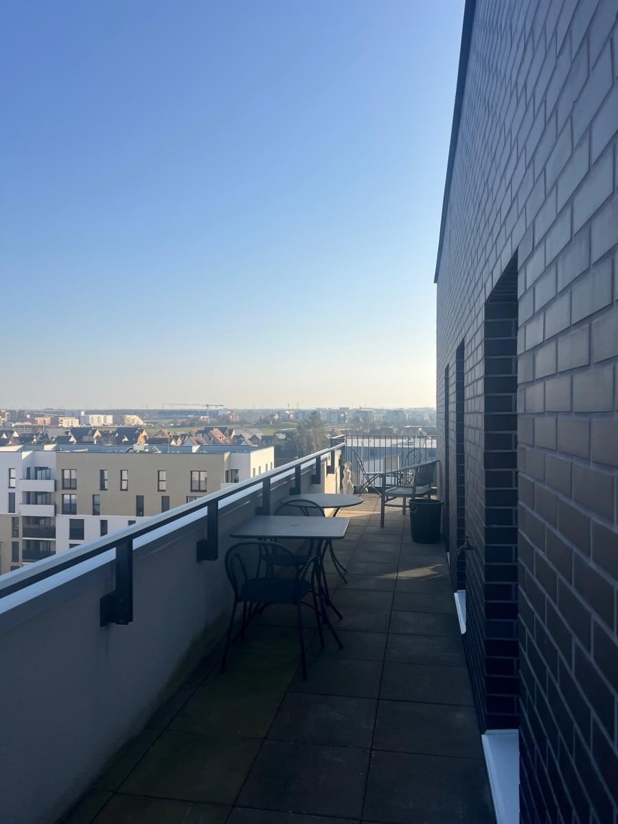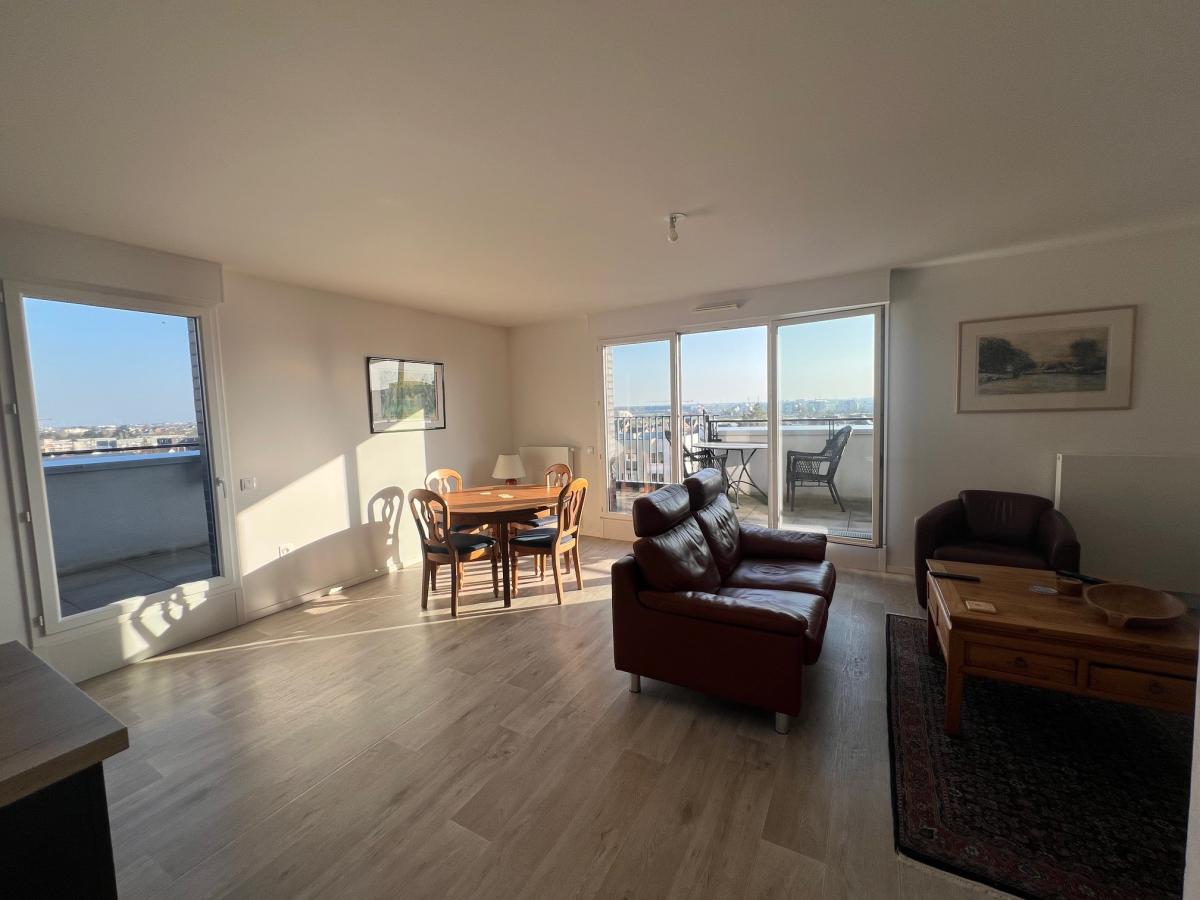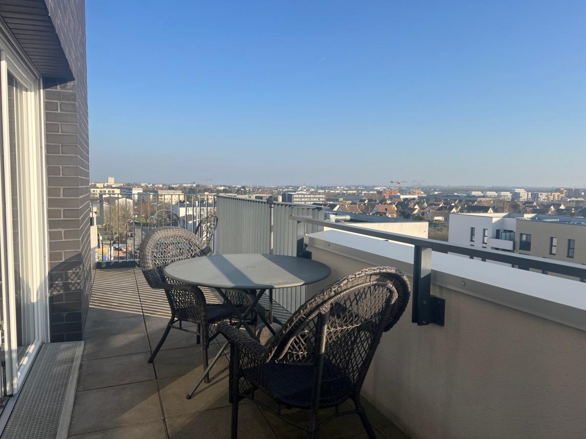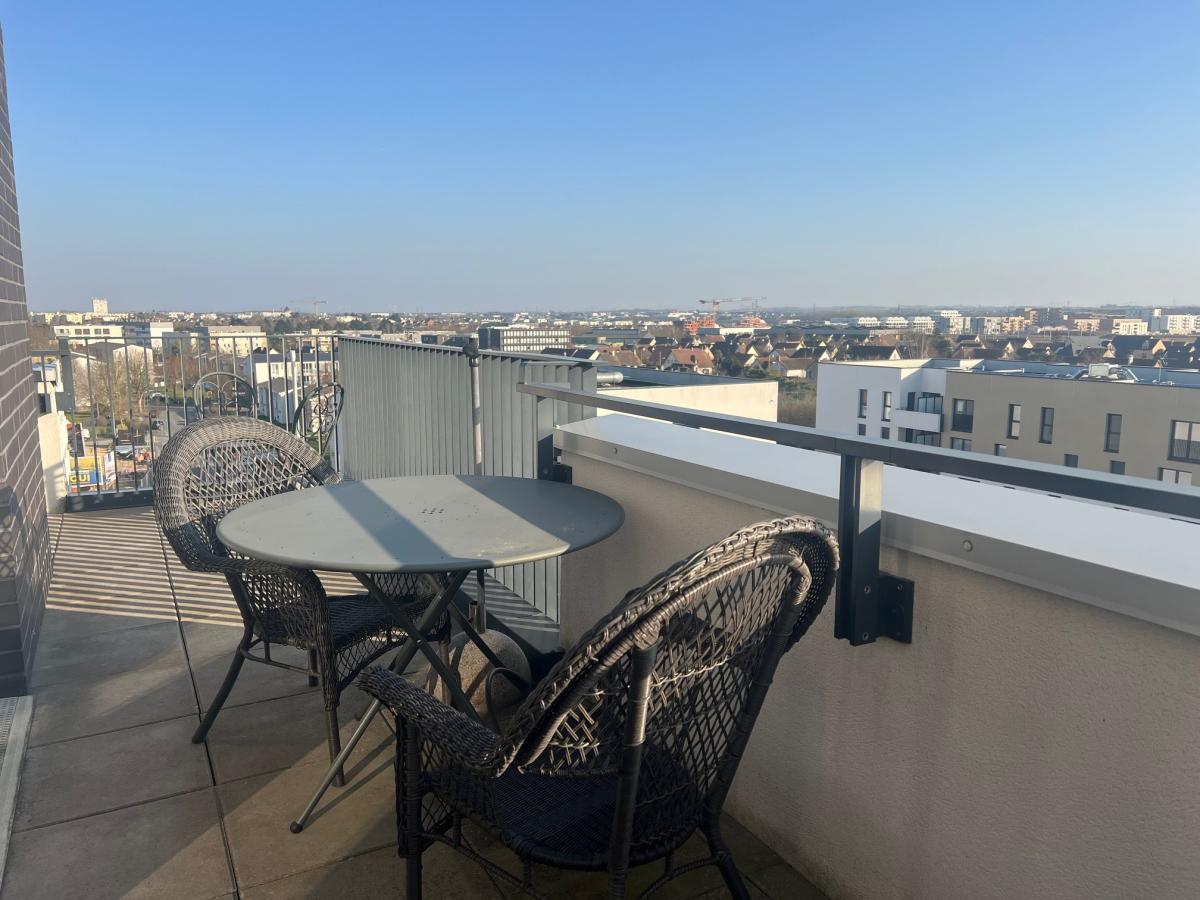CAEN RIVE DROITE au dernier étage d'une résidence de 2019 de bon standing avec ascenseur, beau 5 pièces comprenant cuisine aménagée ouverte sur séjour salon, 3 chambres, salle d'eau, wc, buanderie. Magnifique terrasse de 30 m2 sans vis à vis avec une triple exposition. Parfait état général. Parking couvert. Charges individuelles au gaz 130 euros/mois. DPE : C Contacter : Olivier FAURE au 06.33.17.39.74 pour informations et visites. Bien vendu soumis au statut de la copropriété Pas de procédure en cours dans la copropriété Les informations sur les risques auxquels ce bien est exposé sont disponibles sur le site Géorisques : www. georisques. gouv. fr Consultez nos tarifs : http://www.dvml-notaires.fr/tarif/