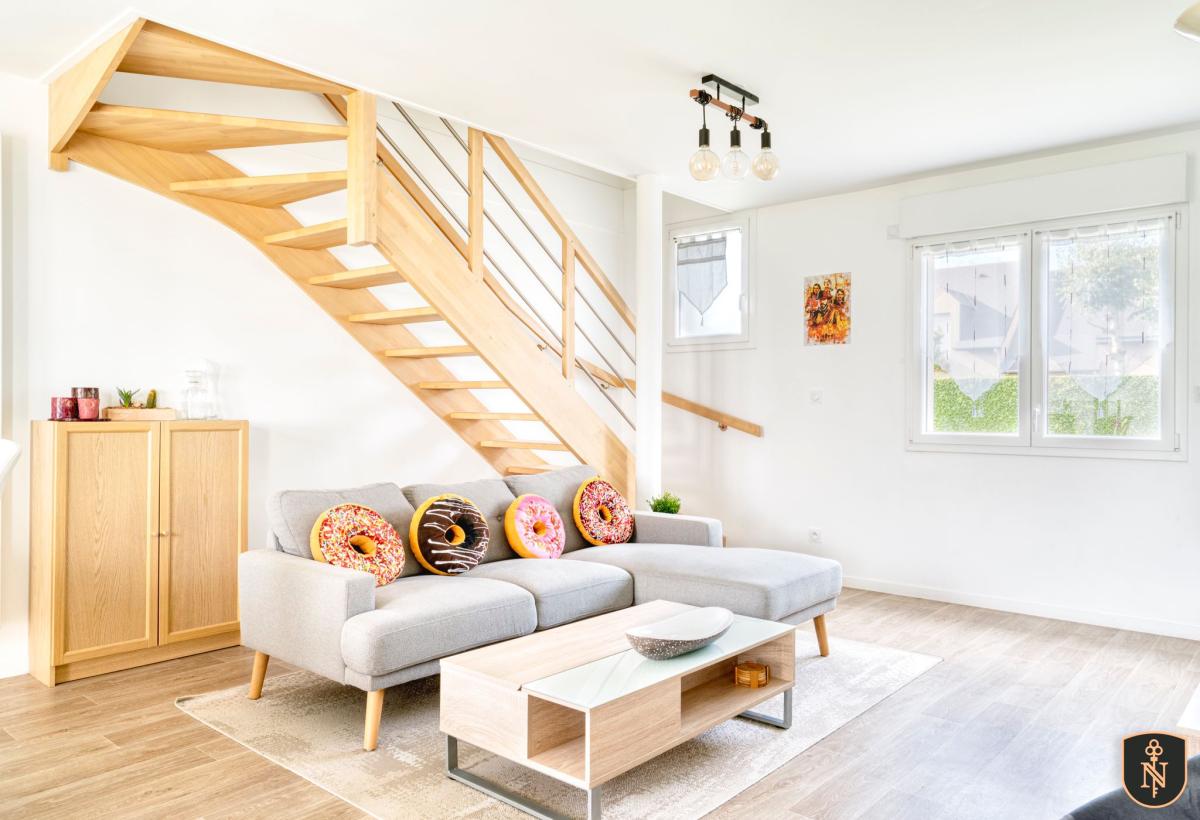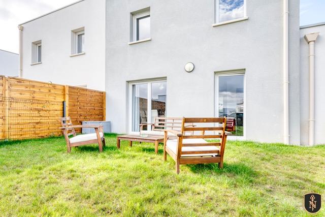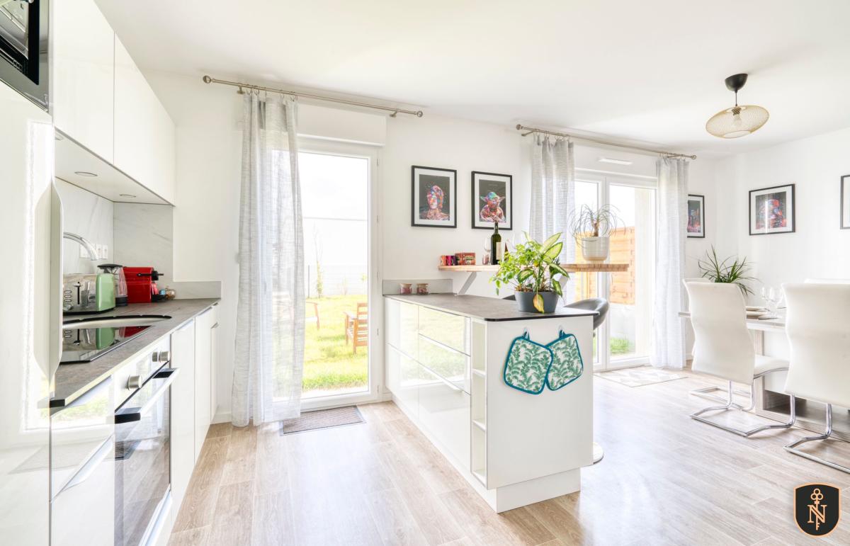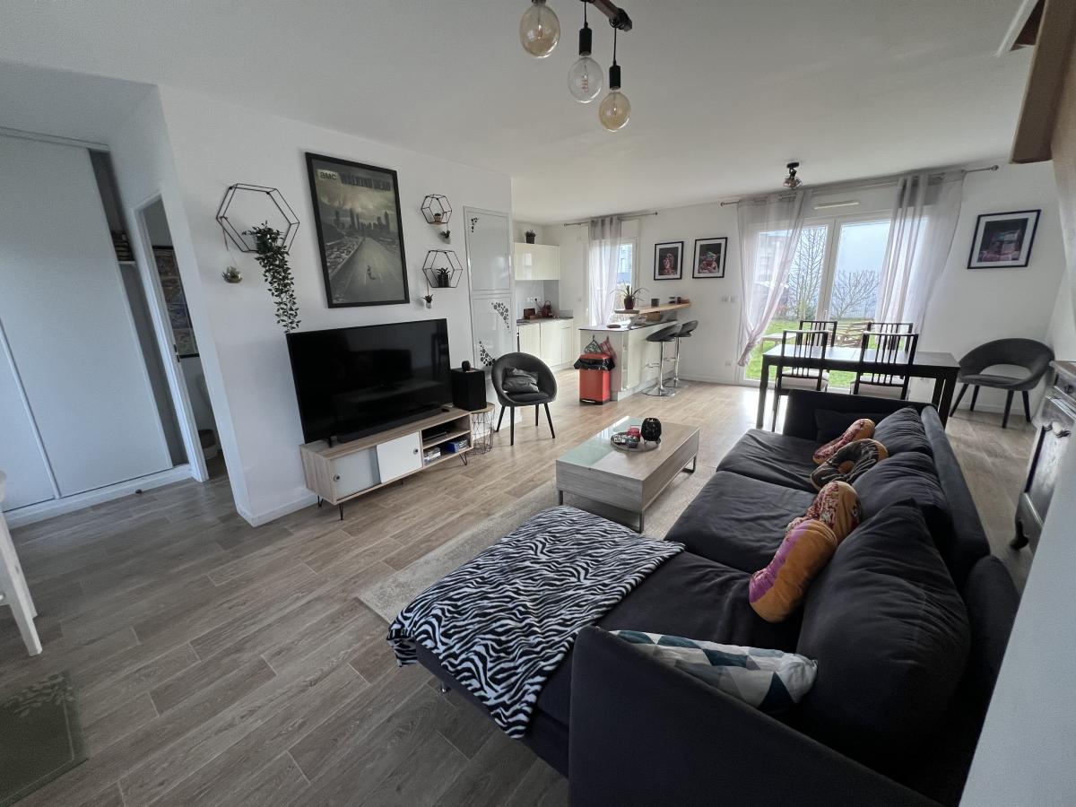 CAMBES EN PLAINE - CAEN NORD bus de ville, ravissante maison 2019 mitoyenne d'un côté, comprenant entrée avec placards, cuisine aménagée ouverte sur séjour salon 35 m2, 3 chambres, salle de bains avec wc, buanderie, wc avec lave mains. Garage attenant. Terrain clos de 240 m2. Chauffage gaz de ville. Parfait état général. DPE : C