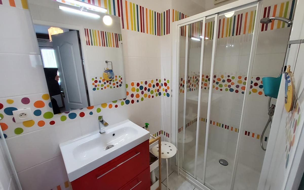 - au rez-de-chaussée : séjour-salon avec poêle à granules, cuisine ouverte aménagée et équipée, salon donnant sur terrasse plein sud, chambre, wc, salle d'eau.