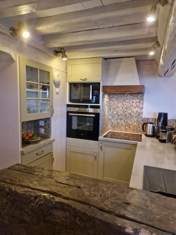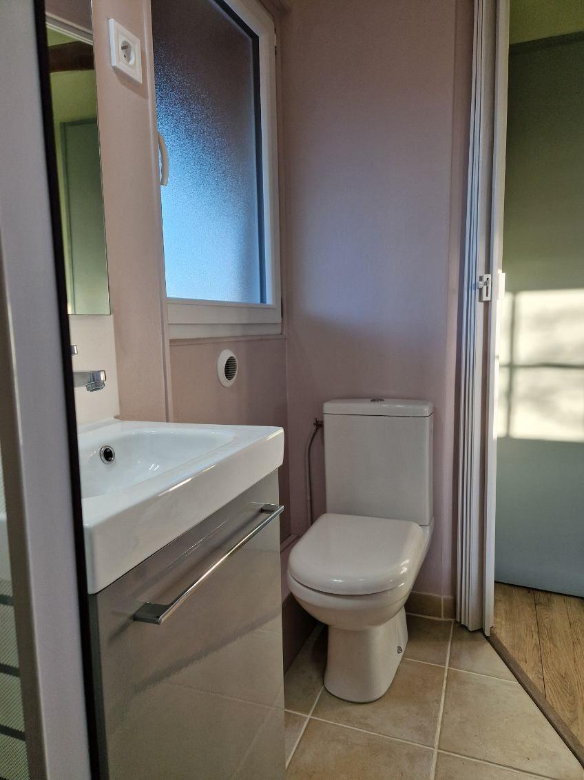 Maison de 115m²: séjour-salon, cuisine dînatoire, chambre, salle de bains et wc.