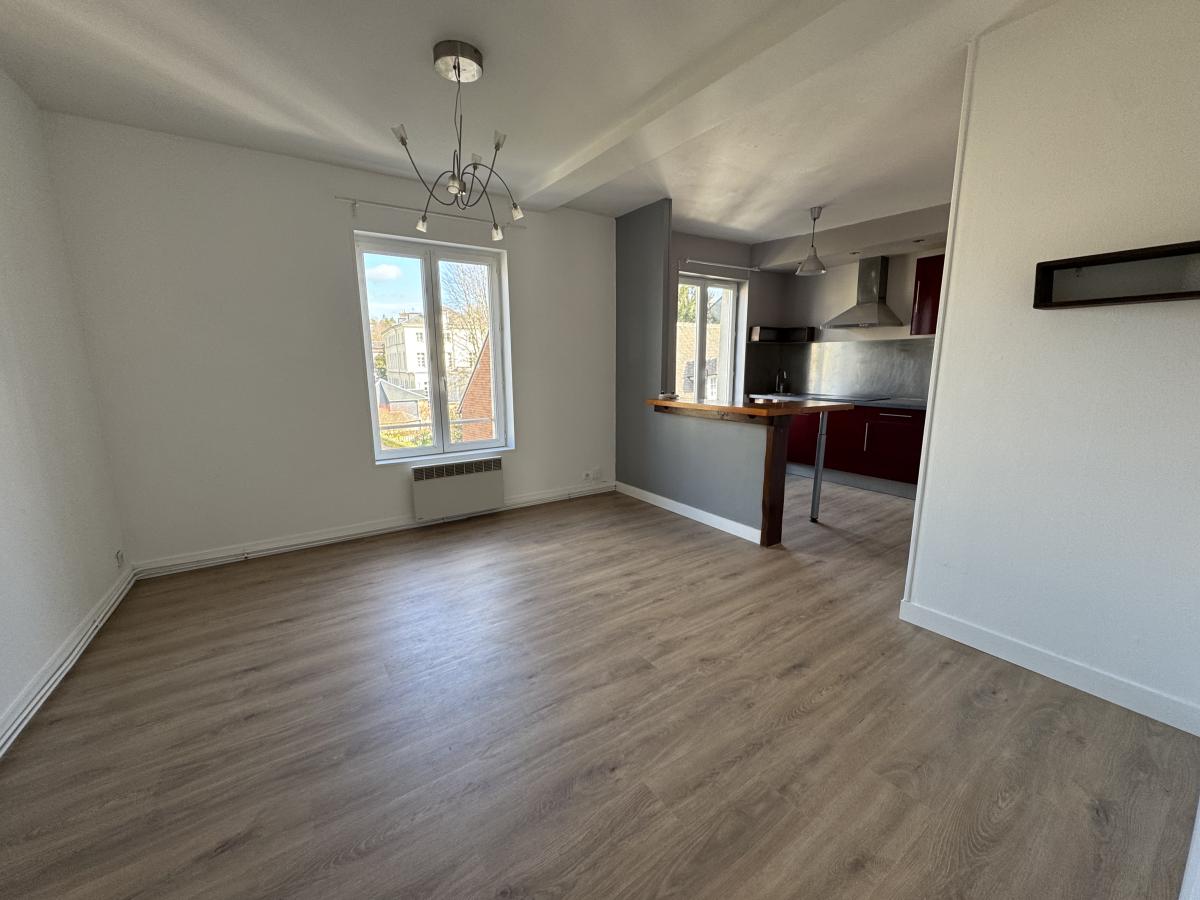 LISIEUX Proche centre: Agréable appartement situé au 2ème étage sans ascenseur, d'environ 46m²: Entrée, pièce de vie avec cuisine ouverte, 2 petites chambres, salle de bains et wc. Débarras Cave au rez-de-chaussée