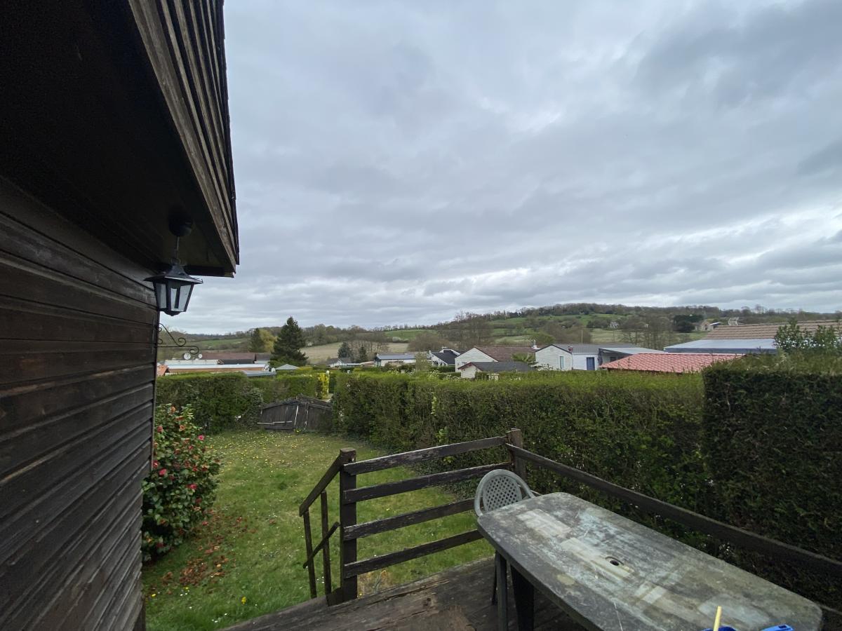 DOZULE, dans un parc résidentiel, chalet de 65m² comprenant, entrée, cuisine, salon/séjour, deux chambres, salle de bains avec wc. Terrasse et jardin 326m². Place de parking.
