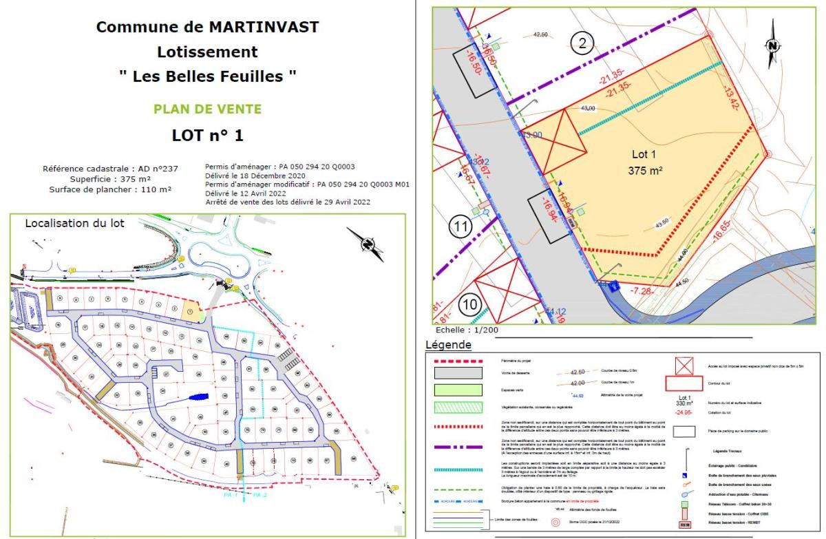 ref 1081 - MARTINVAST, dans lotissement, TERRAIN A BATIR d'une superficie de 375 m2, viabilisé en eau, assainissement, télécom, fibre et électricité. Surface de plancher possible de 110 m2.Les informations sur les risques auxquels ce bien est exposé sont disponibles sur le site Géorisques : www. georisques. gouv. fr Toutes nos annonces sur www.etudenapoleon.notaires.fr