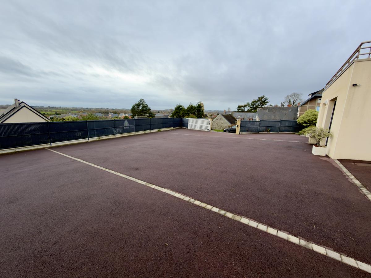 Jardin autour avec cellier et bucher et vaste parking bitumé.