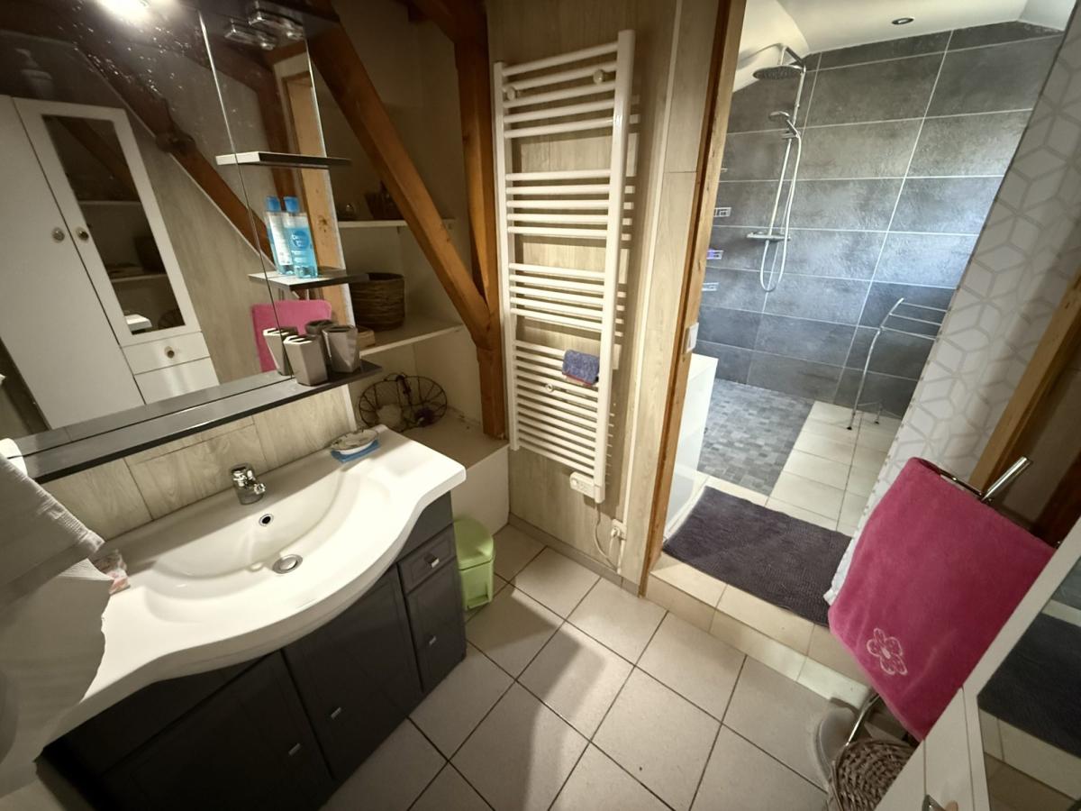 Cuisine équipée ouverte sur un séjour avec poêle à bois et placard, trois chambres dont une avec placard, WC, salle d'eau avec grande douche à l'italienne.