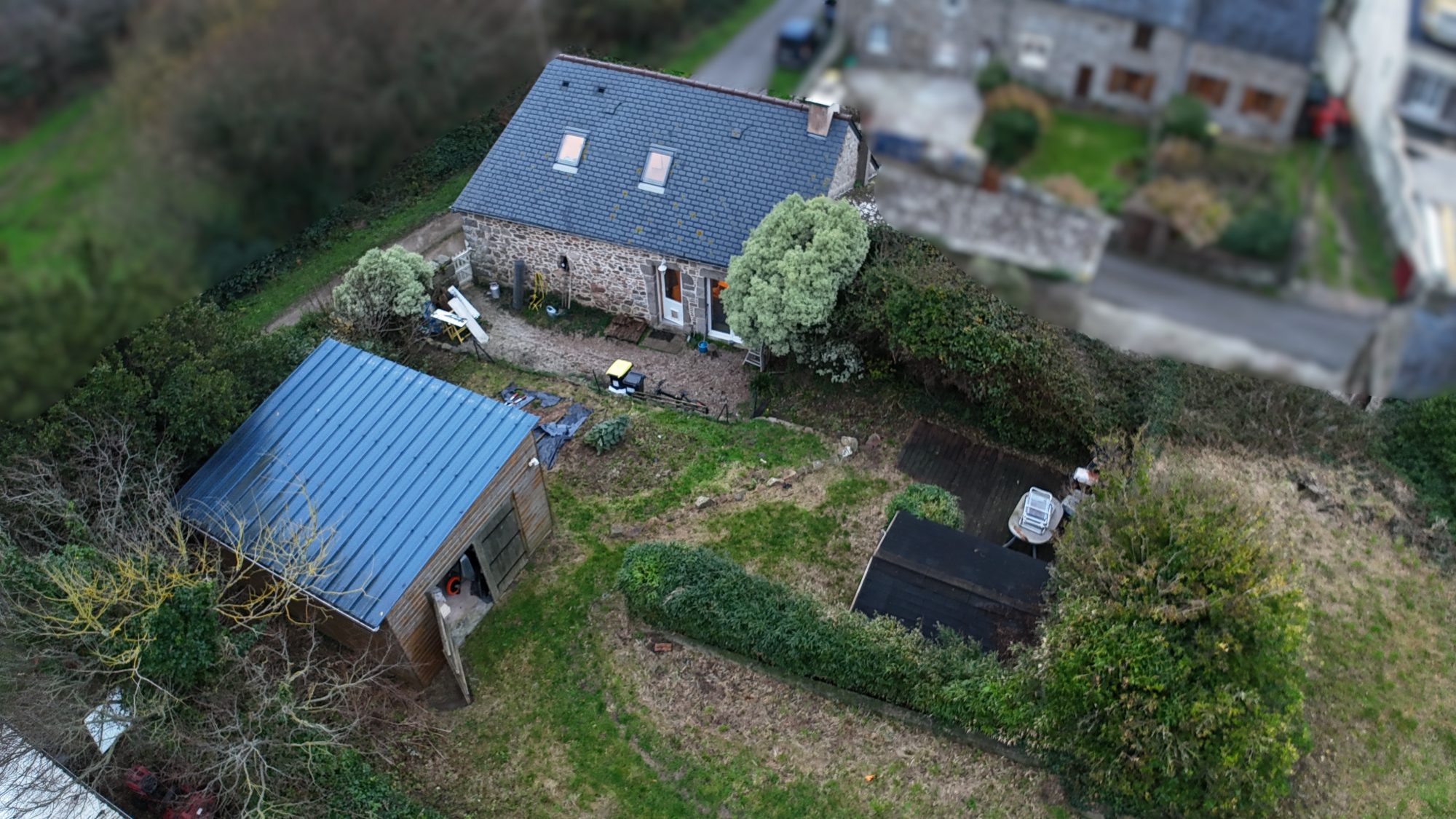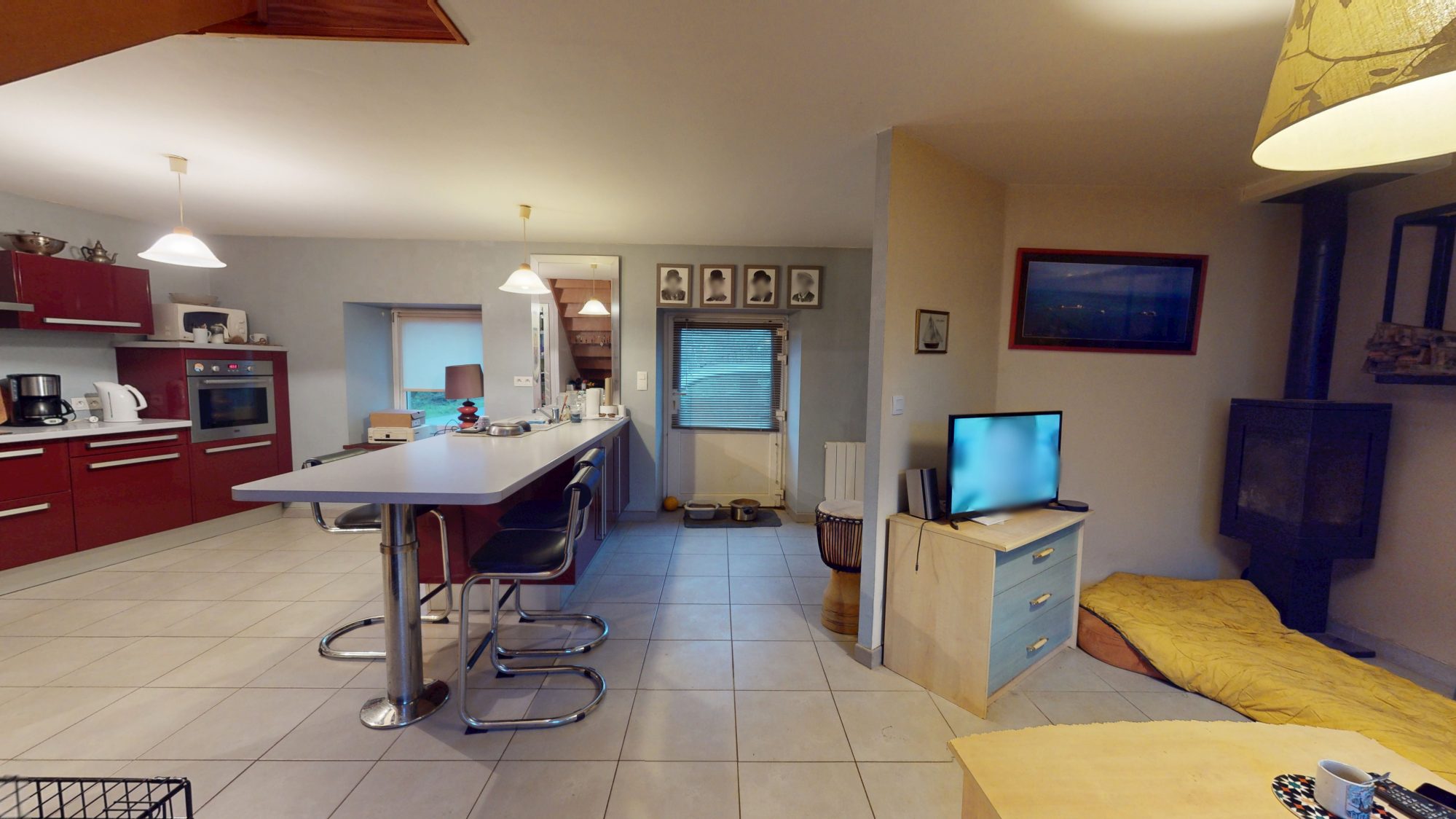 - Au rez-de-chaussée : Séjour/salon avec poêle à bois et cuisine ouverte, buanderie et WC.