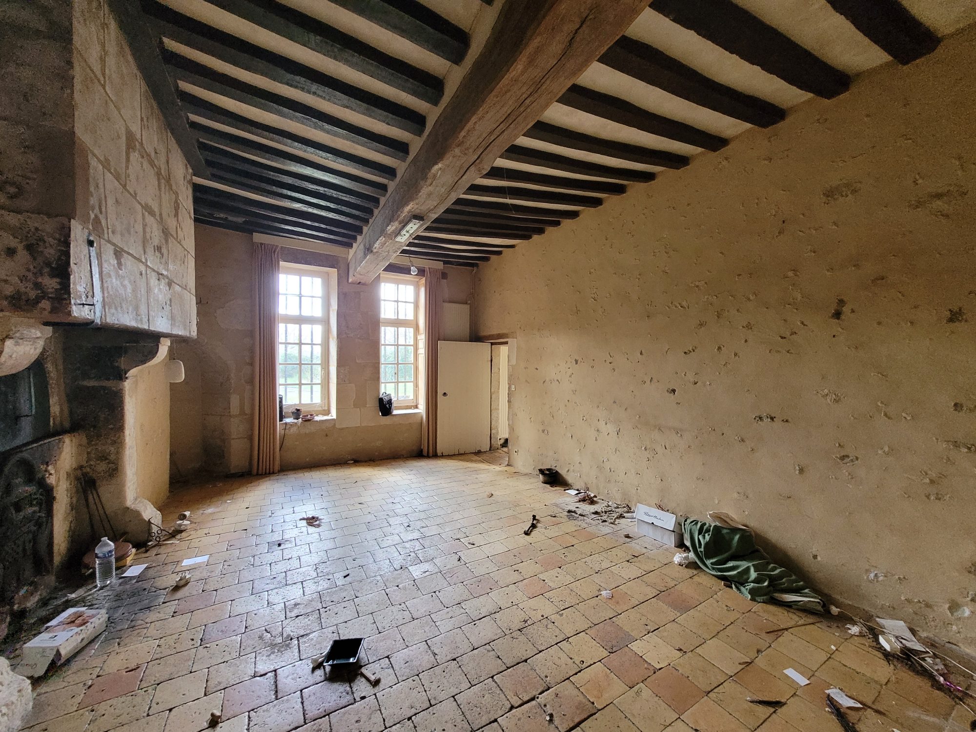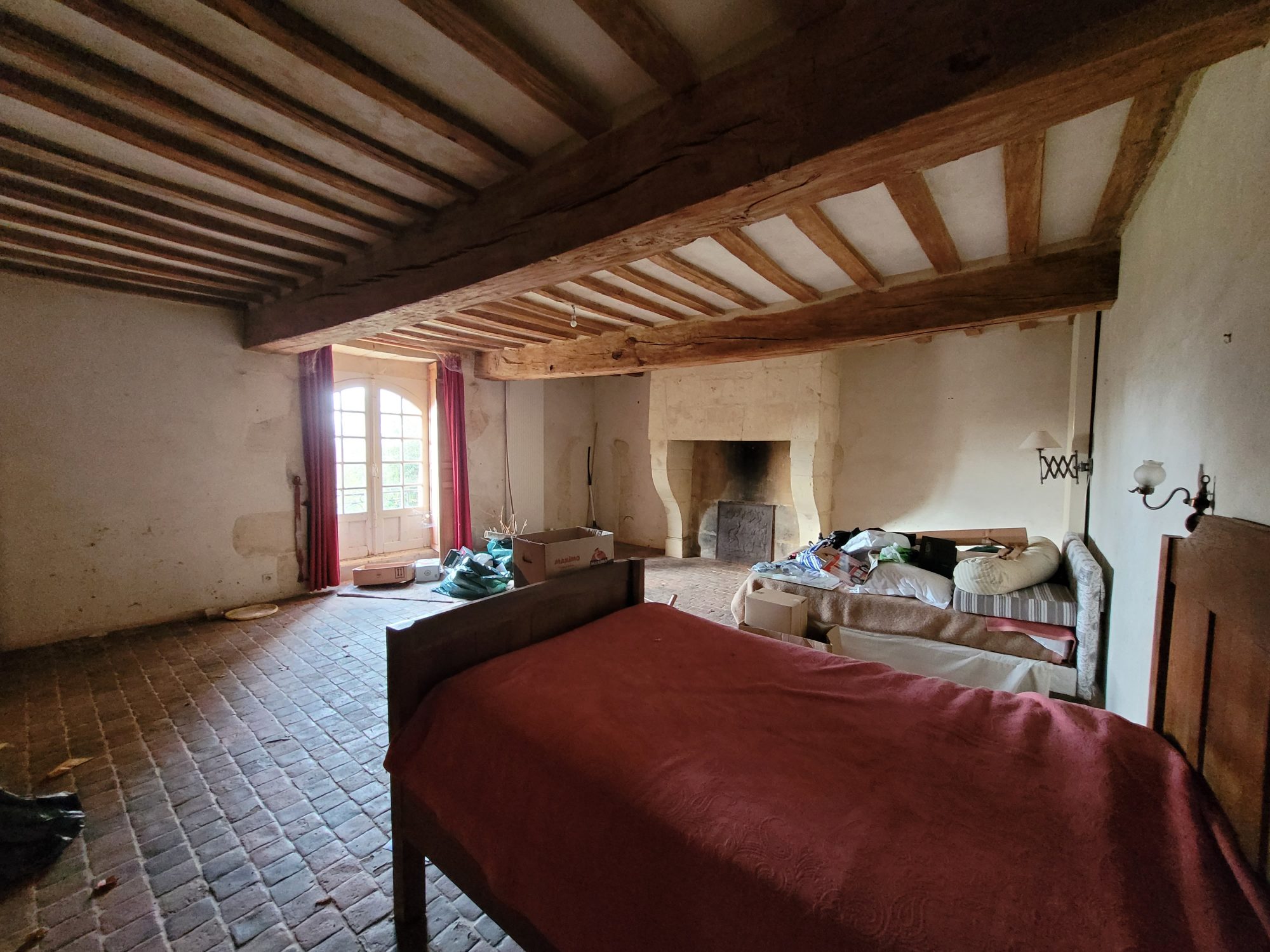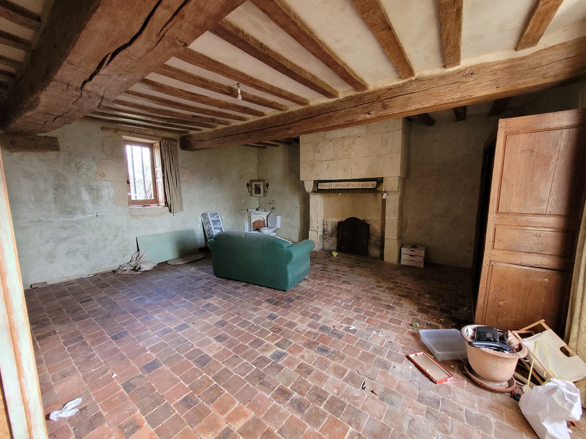 A l’étage : dégagement desservant deux grandes chambres avec chacune leur cheminée et une avec WC et point d’eau. Grenier aménageable sous combles.